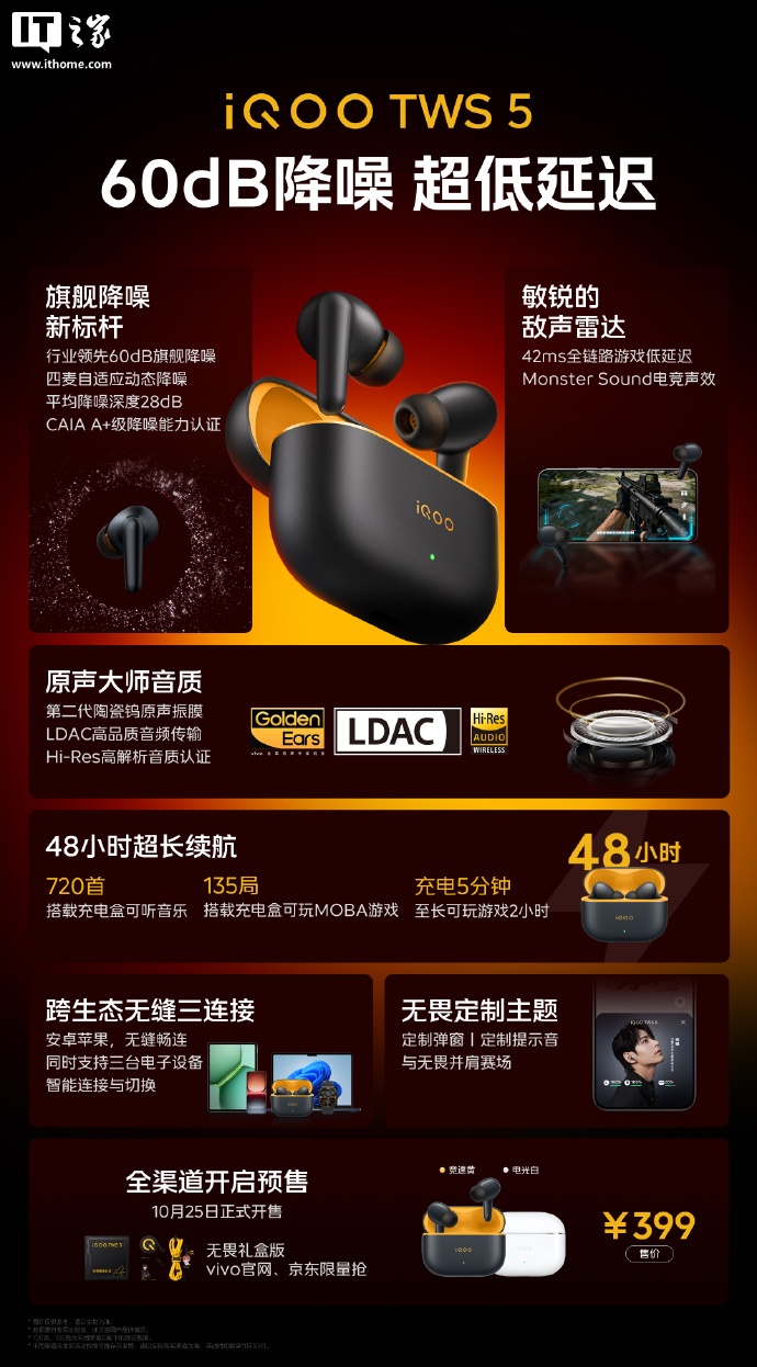 iQOO TWS 5 耳机开售:60dB 旗舰降噪、42ms 游戏低延迟,399 元
