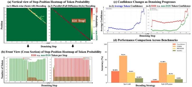 但令人疑惑的是,掩码扩散大语言模型在预训练和指令微调阶段并未针对分块解码这种方式进行适配微调,所以这一现象背后的原因仍不为人所知。该团队基于这点发现刨根问底,最终定位到 MDLM 的全扩散式解码的三个特点: