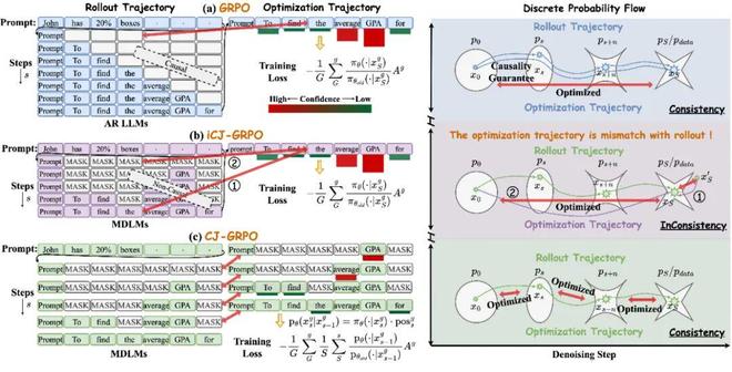 针对 rollout 轨迹和优化轨迹不一致问题,该团队提出一致性轨迹分组策略优化(CJ-GRPO),在 rollout 过程中存储每一步解码的中间状态,逐步优化相邻两个状态之间的转变,从而有效缓解跳步优化(或者说是不一致轨迹优化)带来的误差,提升训练稳定性与效果。
