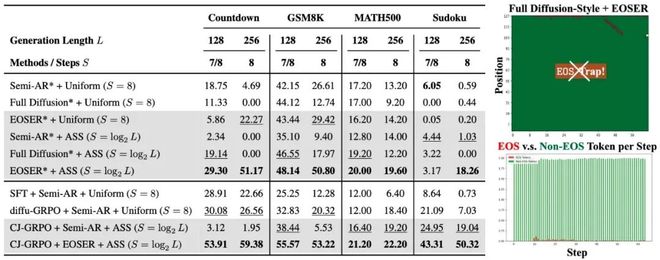 在数学推理(GSM8K、MATH500)和规划任务(Countdown、Sudoku)上,使用 LLaDA-8B-Instruct 模型进行了广泛的实验,结果显示: