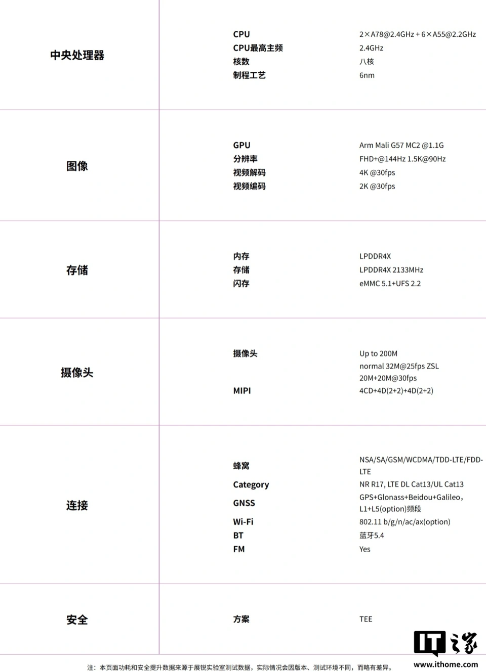 这款 6nm 芯片采用八核 CPU 架构,A78 性能核心,主频达 2.4GHz,较上一代能效提升 38%;采用 Mali G57 双核 GPU 架构、高速闪存 UFS2.2 搭配 LPDDR4X,安兔兔 V10 跑分达 55 万分。