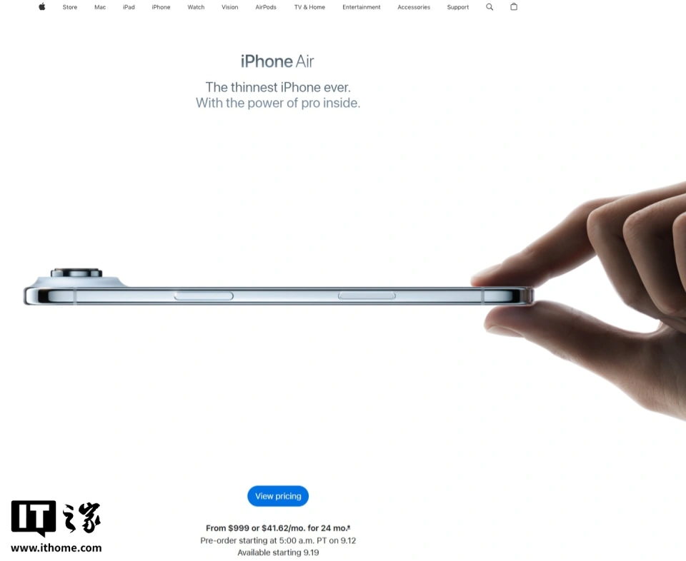 据IT之家今日早些时候报道,在凌晨的苹果 2025 秋季新品发布会上,iPhone Air 正式发布。这款新机首发搭载 A19 Pro 芯片,是迄今最薄的 iPhone,厚度仅有 5.6mm。同时 iPhone Air 还在全球范围内统一采用仅支持 eSIM 的设计,不再配备实体卡槽,国行售价 7999 元起。