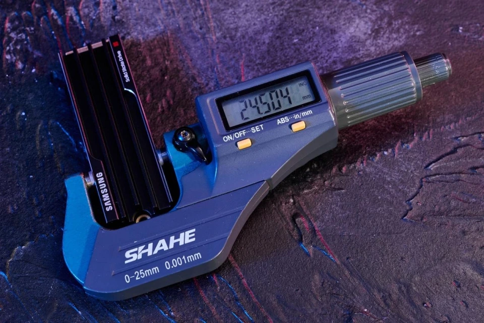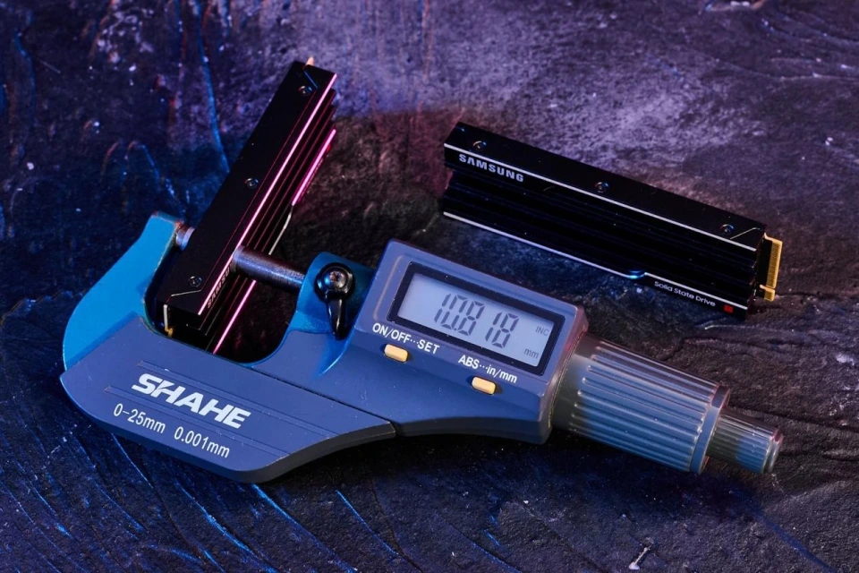 量一下三星 9100 PRO 8TB散热片版的宽度:24.504mm,整体厚度10.818mm。宽度数据与官方的一致,厚度上稍低于官方厚度,但这明显是出于安装兼容性与安规标准而考量。