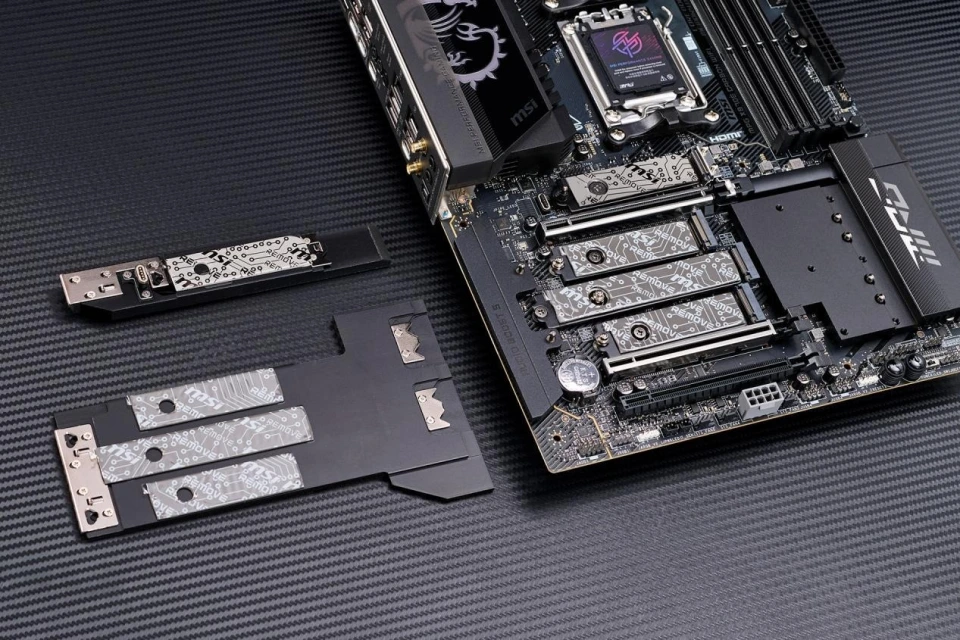 安装兼容性方面,我们拿微星MPG X870E CARBON WIFI 暗黑主板来做测试,M.2_1接口是专门为PCIe 5.0 NVMe M.2 固态硬盘而设,具备较高的传输速率(直连CPU)与优秀的散热效果,双面散热马甲。