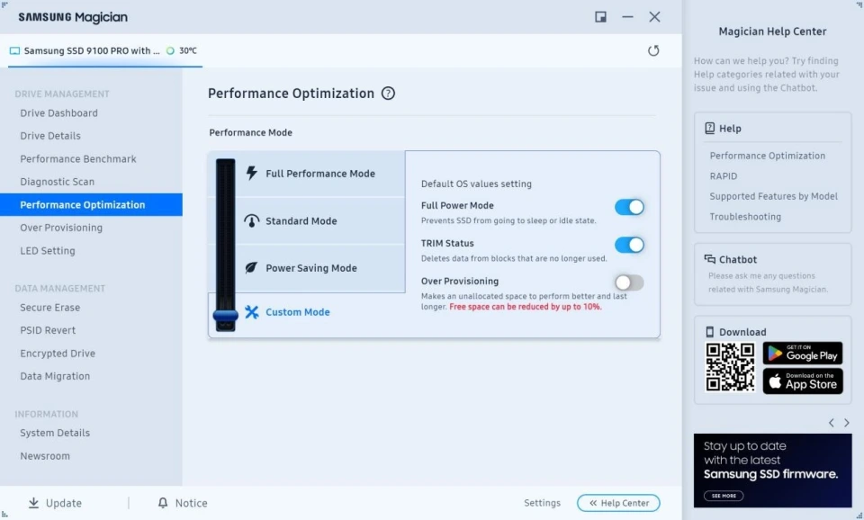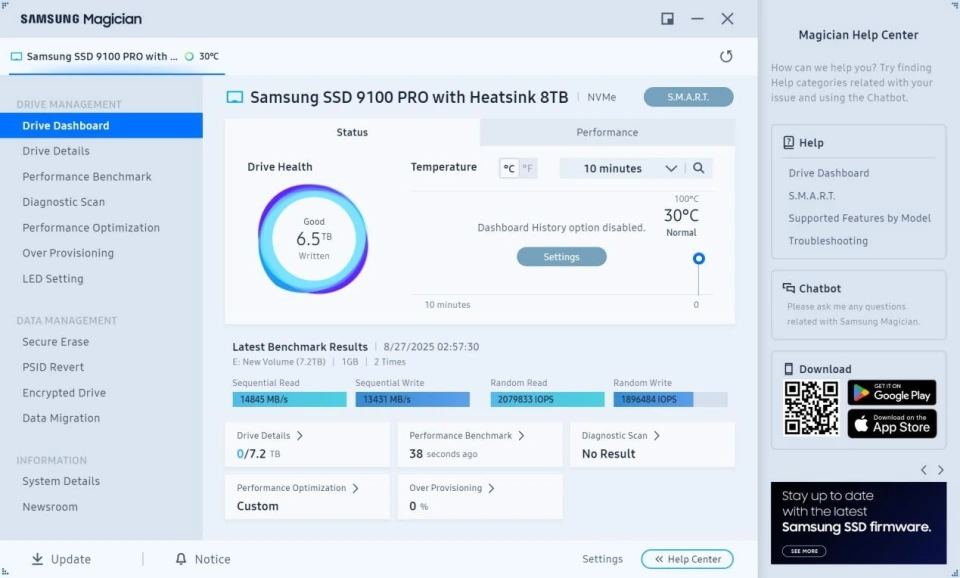 在软件里面不仅能监控到存储设备的运行状况还能进行诸如优化性能,保护有价值的数据,固件更新等系列操作及应用。甚至我们还能看到三星 9100 PRO 8TB所在的接口通道:PCIe 5.0 x4。