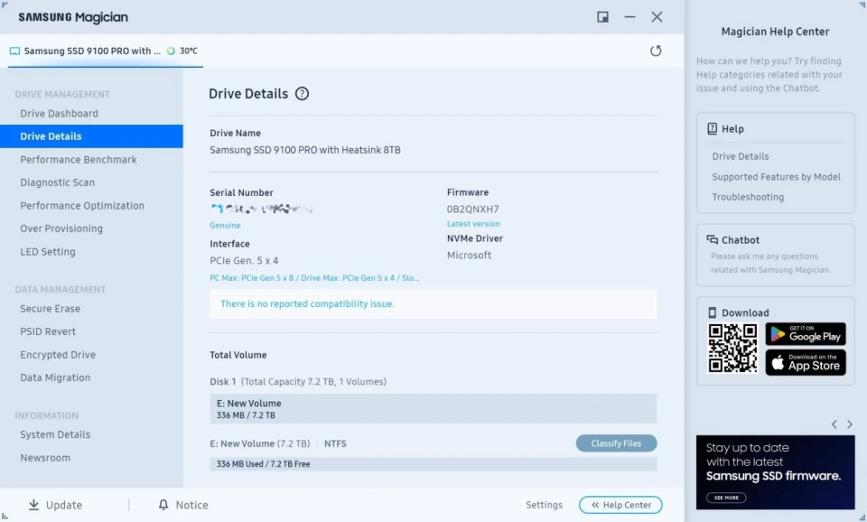 我们下载最新版本的三星SAMSUNG Magician魔术手软件即能够完整识别出三星 9100 PRO 8TB固态硬盘。