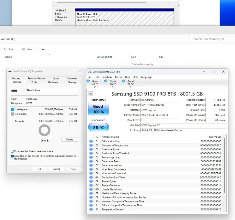 利用硬盘健康状况检测工具CrystalDiskInfo查看硬盘信息,我们看到三星 9100 PRO 8TB固态硬盘的固件版本为0B2QNXH7,传输模式为PCIe 5.0 x4,支持NVMe 2.0标准,支持S.M.A.R.T、TRIM以及VolatileWriteCache功能,待机温度为28度,其待机温度表现比同级产品有一定的优势。