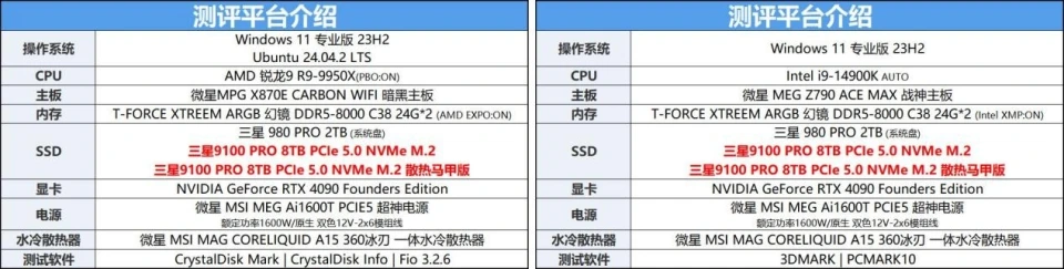 测试平台方面我们不再单独采用同一套平台,而是采用了AMD与INTEL的旗舰测试平台,分别对三星 9100 PRO 8TB进行测试。
