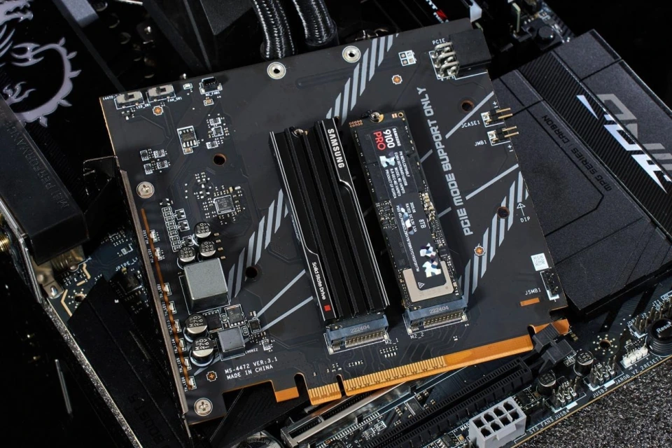 本次测试中,由三星 9100 PRO 8TB将在微星M.2 Xpander-Z Gen 5扩展卡上进行测试,该扩展卡接口标准为PCIe 5.0 x8,PCIe 5.0通道均为处理器分配而来,可以完全满足两个PCIe 5.0 x4 NVMe M.2 固态硬盘对高带宽的需求。