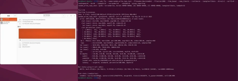 为了进一步验证三星 9100 PRO 8TB强劲的IOPS性能,我们把测试平台系列换成了Ubuntu 24.04.2 LTS,并使用FIO软件进行测试。在QD256线程32的测试条件下,三星 9100 PRO 8TB的4K随机写入峰值性能分别表现为 2613K IOPS。
