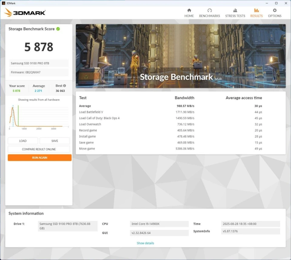 在3DMark存储测试中,三星9100 PRO 8TB取得了5878分的总成绩,平均带宽高达988.57MB/s,访问时间仅为30微秒。特别值得一提的是,在加载《战地风云5》游戏时,其加载带宽更是达到了惊人的1711.90 MB/s,访问时间仅为44微秒。