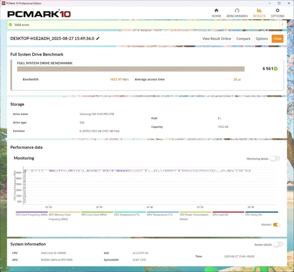 在PCMark 10的存储基准测试里,三星9100 PRO 8TB于完整数据盘测试中斩获6561分,带宽高达1027.47 MB/s,平均访问时间仅25微秒。这一成绩在同价位固态硬盘中处于顶尖(T0)水准。