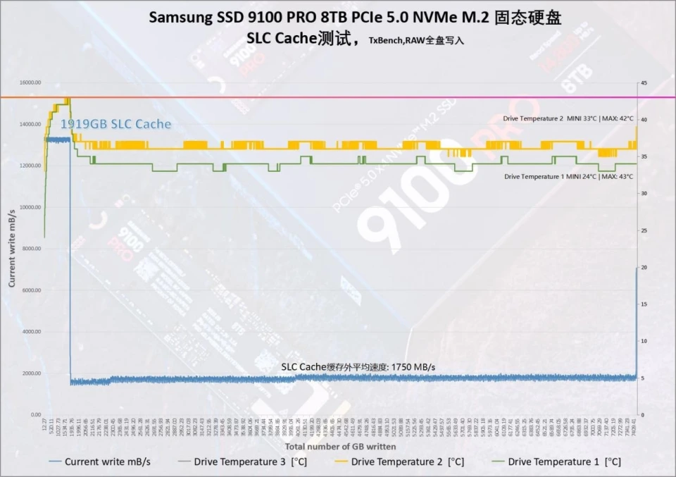 接下来,我们会对三星9100 PRO 8TB的SLC缓存容量展开测试。通过在RAW状态下利用TxBench进行全盘写入测试,同时借助HWINFO64软件监测温度,我们发现其SLC缓存容量高达1919 GB。