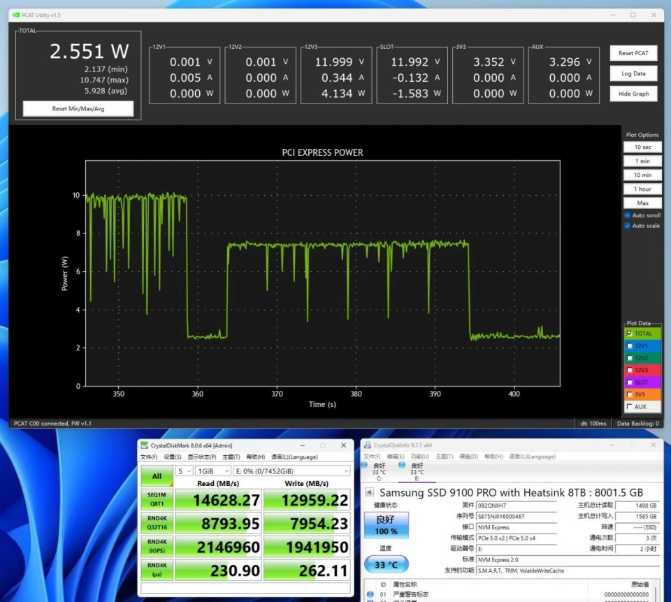 相比之前我们对三星9100 PRO 4TB进行测试,其最大功耗为8.06W,三星9100 PRO 8TB最大功耗达到10.747W,这一表现相当出色。由此可见,三星9100 PRO 8TB在读取时每瓦能达到1361.14 MB/s的速度,这一水平在PCIe 5.0固态硬盘中处于旗舰级别,甚至比其他品牌的4T产品功耗还要低。
