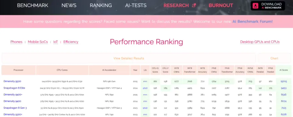具体来说,天玑 9500 带来了全新的超性能和超能效双 NPU。首先是专为超强端侧 AI 体验而打造的超性能 NPU 990。其峰值性能相较上一代翻倍提升,高达 111%,在苏黎世 AI BenchMark 中取得了超过 15,000 分的惊人成绩,再一次摘得行业第一的桂冠,持续霸榜。