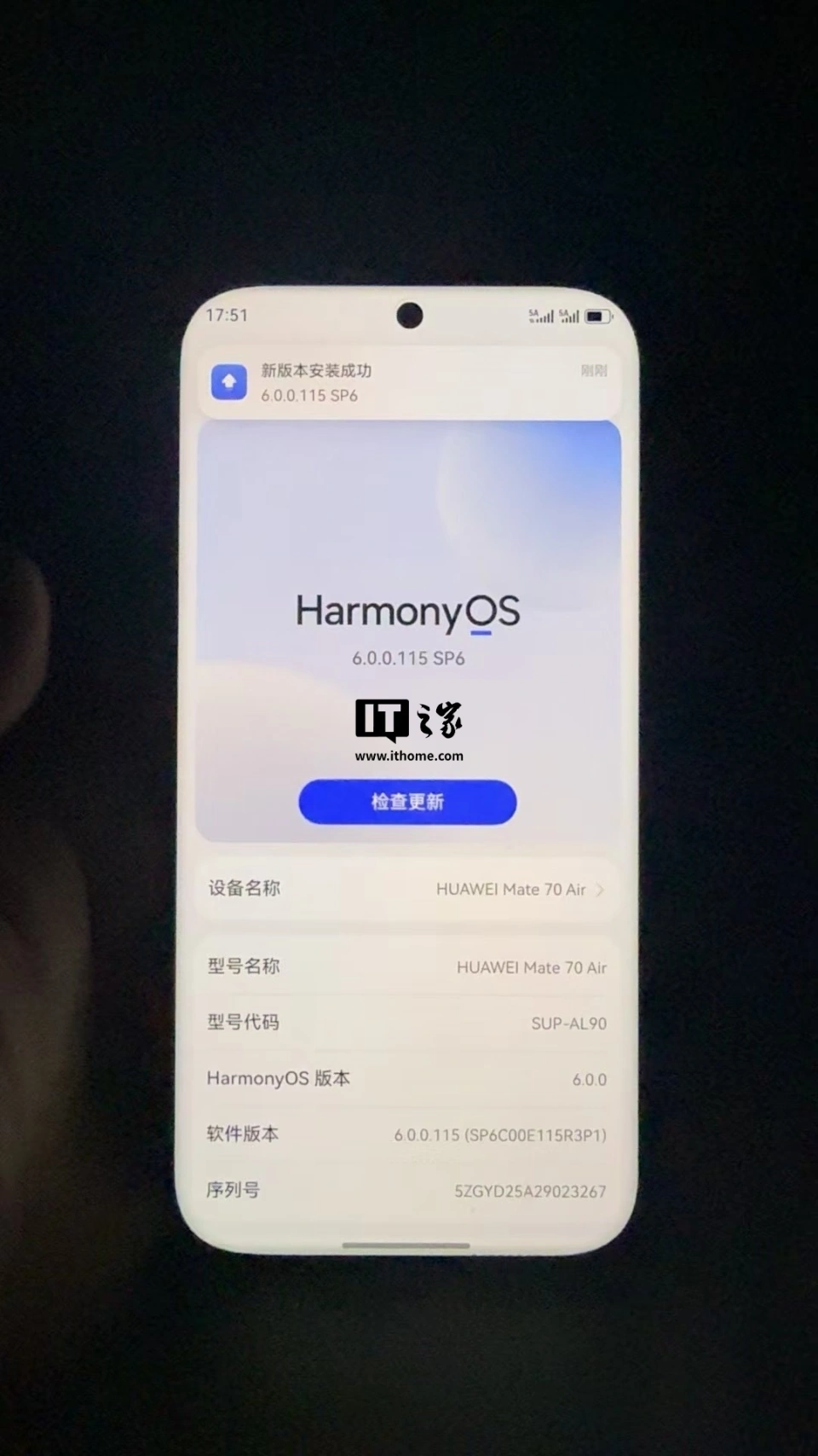 目前,华为 Mate 70 Air 已更新了鸿蒙 HarmonyOS 6.0.0.115 SP6 版本,支持了 5A 先进通信技术外显。