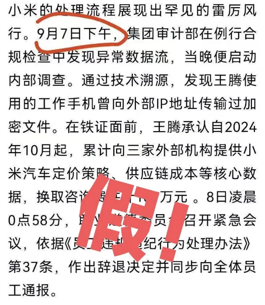 针对网络流传的 “窃取公司机密出售” 等不实信息,小米前高管王腾公开辟谣。他表示,自身存在工作失职行为,但绝无窃取小米汽车定价策略、向外部传输加密文件等违法行为,网传 “换取利益泄密” 等情节均为虚假信息。小米方面回应称,会依规处理内部管理问题,同时对恶意传播虚假信息的行为,将保留追究法律责任的权利。