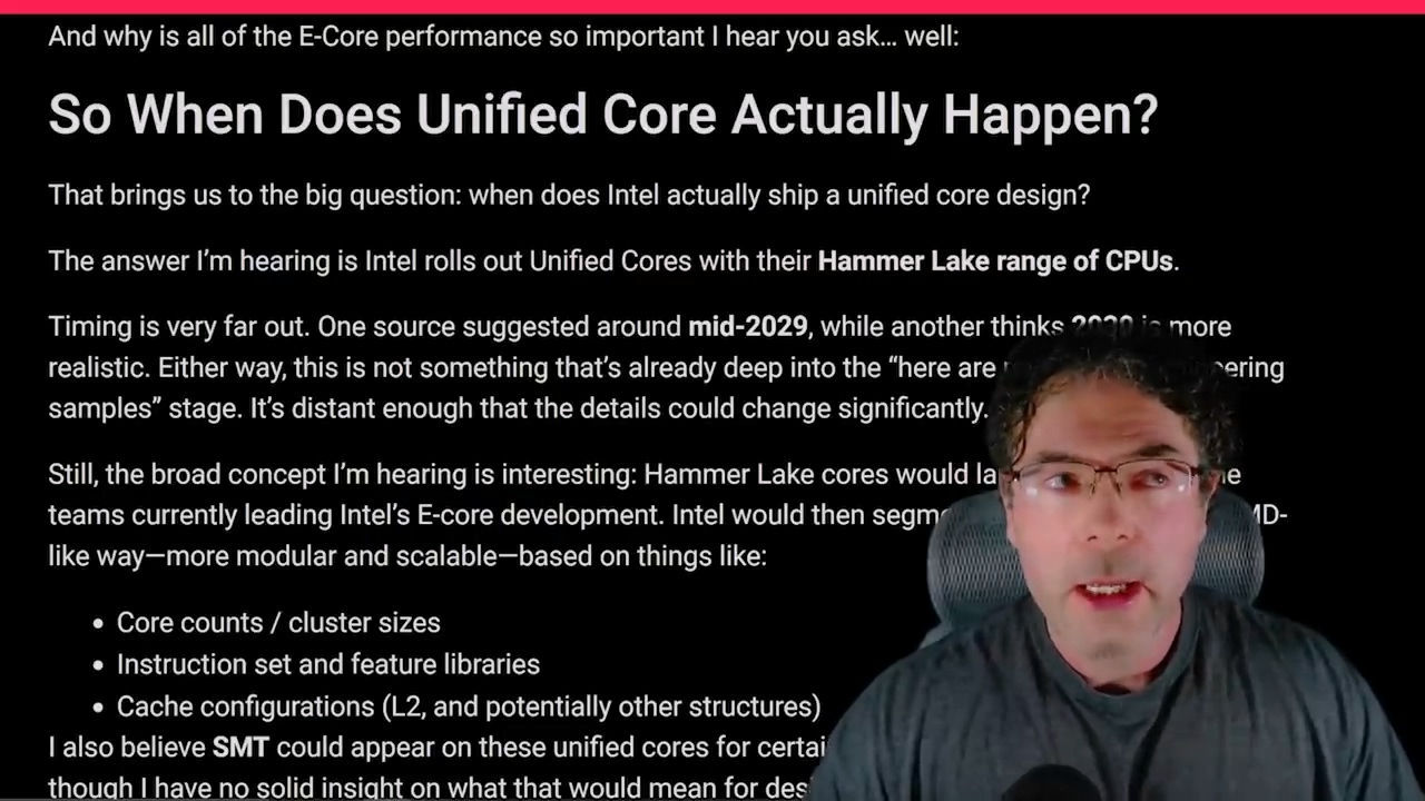 消息源透露英特尔正在规划一项激进的架构转型,在代号为 Hammer Lake 的处理器中,英特尔计划放弃目前使用的异构混合架构(即独立的 P 核与 E 核),转而采用全新的“统一核心”(Unified Core)设计(可能在 2029 年年中或之后推出)。