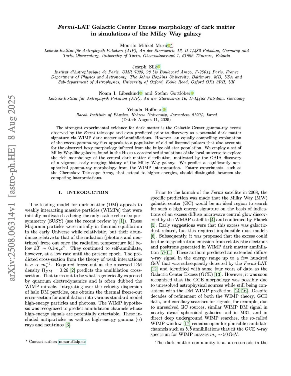 Muru, M. M., Silk, J., Libeskind, N. I., Gottlöber, S., & Hoffman, Y. (2025). Fermi-LAT Galactic Center Excess Morphology of Dark Matter in Simulations of the Milky Way Galaxy. Physical Review Letters, 135(16).