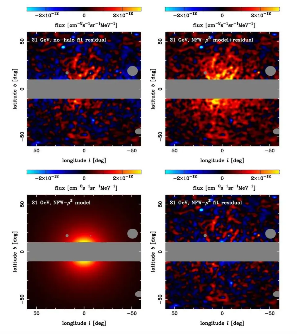 为了避免类似问题,有科学家另辟蹊径。2025年11月,一篇发表于《宇宙学与粒子天体物理杂志》上的文章中,来自东京大学的天文学家尝试了个新思路:既然银河系中心太混乱,那咱就没必要和它死磕,咱可以把视线往两边稍微挪挪。于是,作者剔除了银盘上下10度以内的区域,直接把目光投向了银心的上下两个晕区。诶对,就是之前说的“费米气泡”的那个位置。