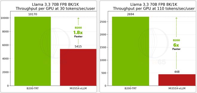 再来看,当交互性提升至110 tokens/sec/user时,这一优势进一步被放大:B200吞吐量超过MI355X的6倍。