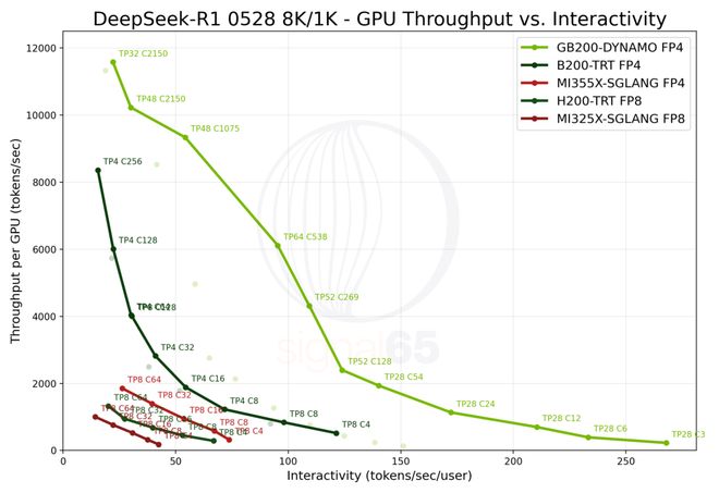 在同样25 tokens/sec/user下,GB200 NVL72单GPU性能大约是B200的2倍、是MI355X的5.9倍;