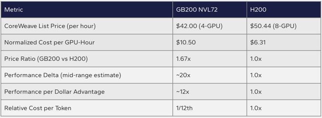 据CoreWeave公布的目录价,按单GPU口径,GB200 NVL72价格大约比H200贵1.7倍。