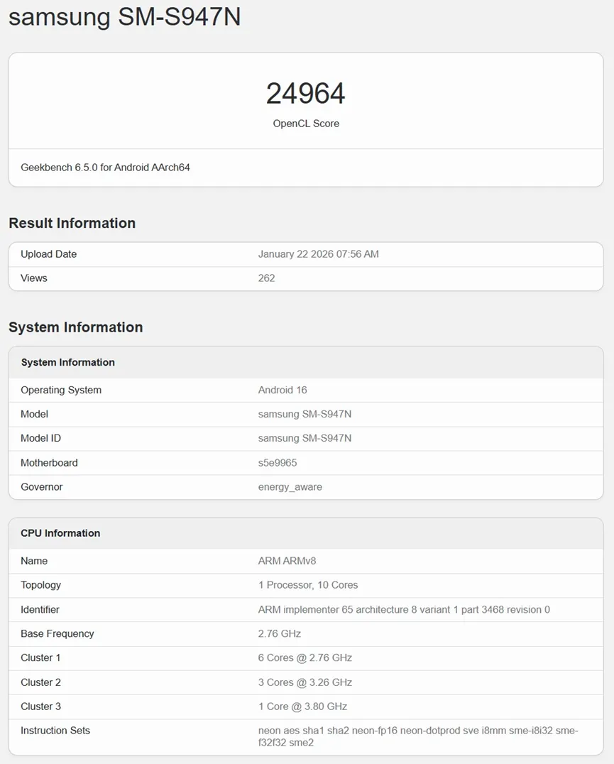 在Geekbench 6 OpenCL测试中,Xclipse 960 GPU取得了24,964分的成绩,正式成为Geekbench浏览器Android基准测试列表中OpenCL速度最快的处理器,比荣耀Magic8 Pro搭载的高通骁龙8 Elite Gen 5处理器(23,634分)高出1000多分。即使与搭载完整版 Windows on Arm 系统的笔记本电脑相比,Xclipse 960 的性能也相当出色,其性能远超联想 Yoga Slim 7x 14中搭载的骁龙 X Elite Adreno X1-85 GPU——在相同的 OpenCL 测试中,Xclipse 960 的得分为 20,771 分。作为更直接的比较,Xclipse 960 的前代产品 Xclipse 950在相同的 OpenCL 基准测试中得分为 18,509 分。
