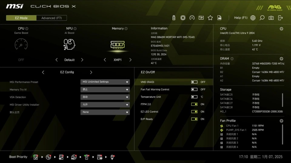 BIOS方面,主板采用新版Click BIOS X界面,操作逻辑清晰,功能归类合理。BIOS支持4档性能模式(默认/Performance/Extreme/Unlimited),可调节CPU功耗墙和内存优化设置。特别值得一提的是,BIOS提供了NPU AI Boost三档调节功能,可以进一步提升AI计算性能,充分发挥处理器内置NPU的潜力。