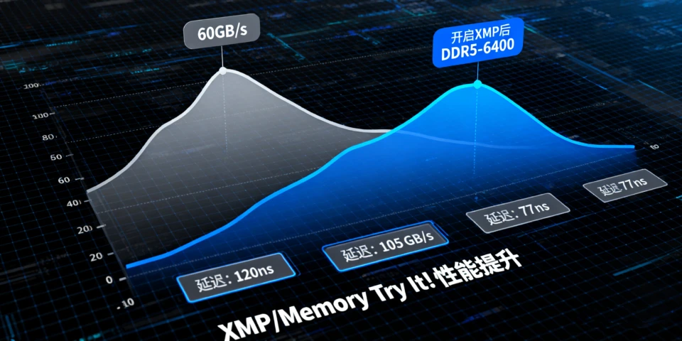 内存性能是平台的另一大亮点。在开启XMP或Memory Try It!功能后,DDR5-6400内存读取速度可达100GB/s以上,延迟约80ns左右,这为游戏和内容创作提供了强大的数据处理能力。值得注意的是,虽然处理器支持高频内存,但实际应用中内存延迟可能成为性能瓶颈——在DDR5-6400下延迟约77-82ns,这在高负载游戏中可能会有所体现。