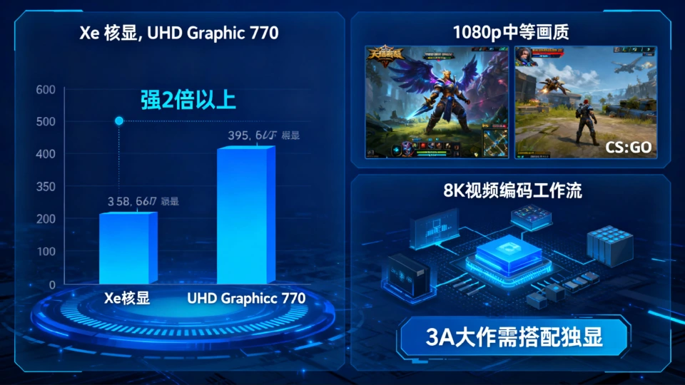 核显性能方面,Xe核显在图形处理上比前代UHD Graphics 770强2倍以上,能够支持1080p分辨率下的中等画质游戏,如《英雄联盟》、《CS:GO》等,但面对《赛博朋克2077》等3A大作时,仍需搭配独立显卡才能获得流畅体验。核显的8K视频编解码能力使其成为内容创作者的理想选择,无需额外购买独立显卡即可处理高清视频素材。