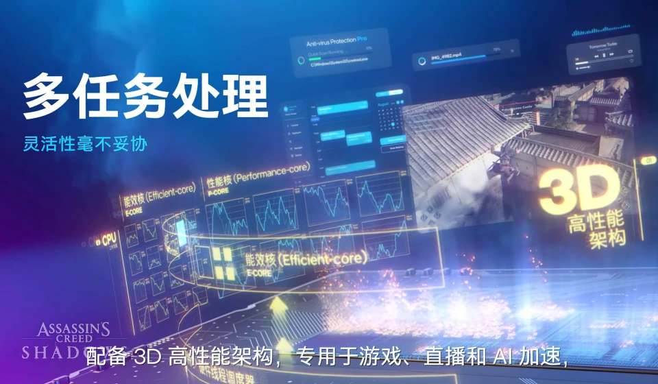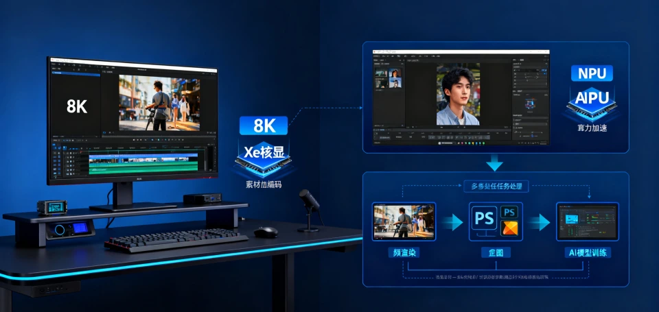 内容创作者与生产力用户。处理器的多核性能和NPU加速能力,使其成为视频剪辑、图像处理和AI任务的理想选择。特别是对于需要处理8K视频素材或进行AI图像生成的用户,Xe核显的编解码能力和NPU的算力优势将带来显著提升。