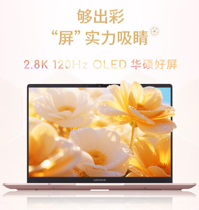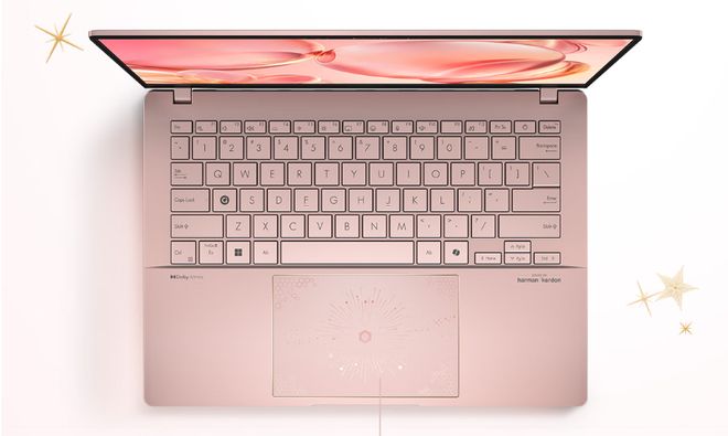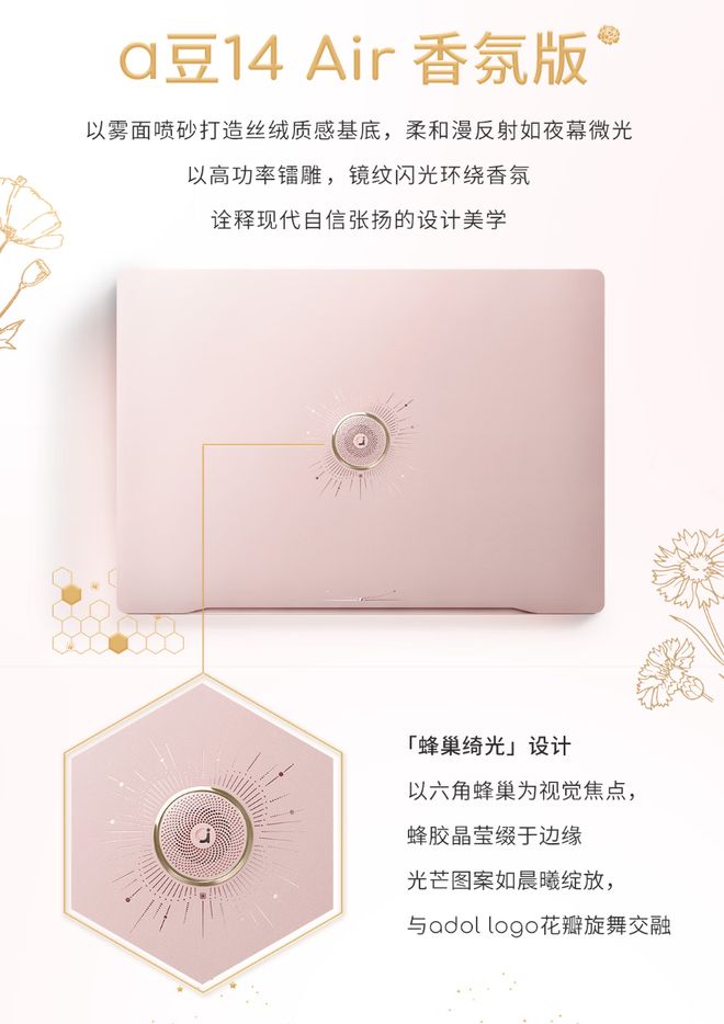 最重磅的华硕 a 豆 14 Air 香氛版笔记本,则秉持了“向美而生”的品牌哲学,将 a 豆 logo 化作光之蕊心,并汲取娇兰蜂巢的自然元素,光芒图案如晨曦绽放。