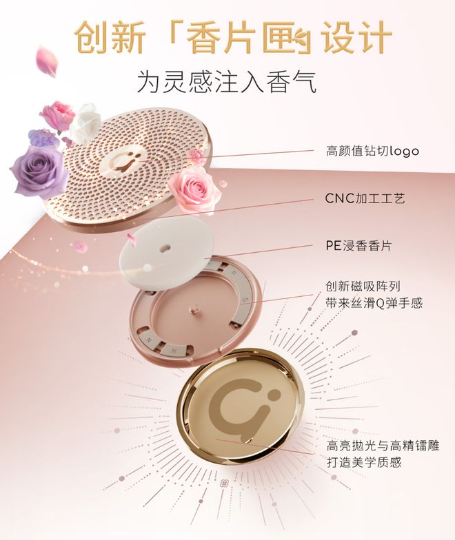 「瑰蜜粉金」主题配色,延续独创香片匣设计,特调「晨曦之舞」香调,丰富嗅觉感官体验。CNC 工艺加金色钻切 Logo、金属装饰环以及花瓣样式的散香网孔巧妙融为一体,打造独特的「蜂巢绮光」造型,精致设计贯穿每一处细节。