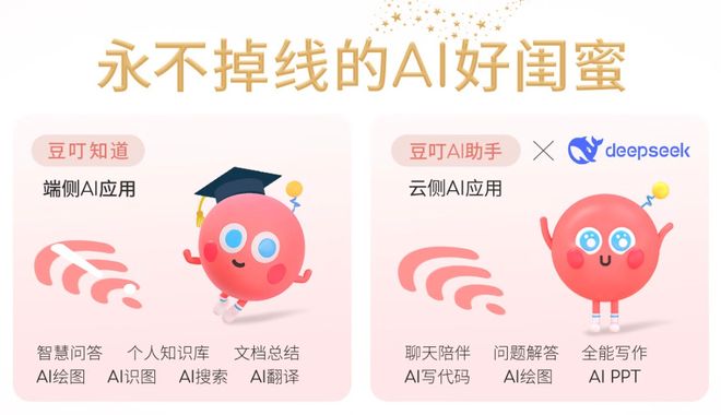 而在联网状态下,可以使用另一款内置的豆叮 AI 助手,现已接入 deepseek 大模型,写文案、写讲稿、写邮件、生成图片编写代码、撰写 PPT,豆叮 AI 助手都能迅速响应,提供精准且富有创意的解决方案,成为初入职场用户在工作中提升效率的得力助手。
