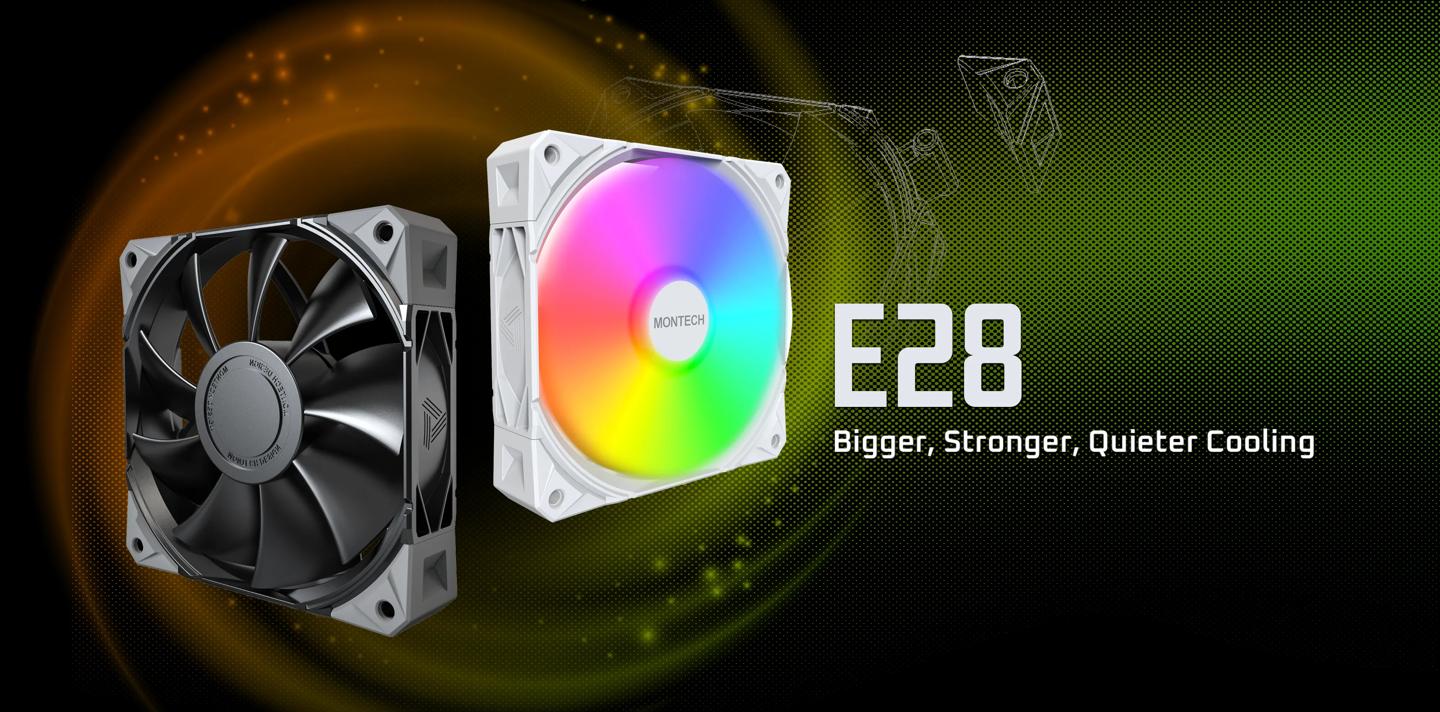 MONTECH 还一并发布了 E28 风扇的一般版本,最大转速降至 2000 RPM,最大风量 85.09 CFM、最大风压 3.35 mmH2O、最大噪声 34.17 dB(A),可选黑 / 白两种配色、有 / 无 ARGB,以单颗或三入包形式提供。