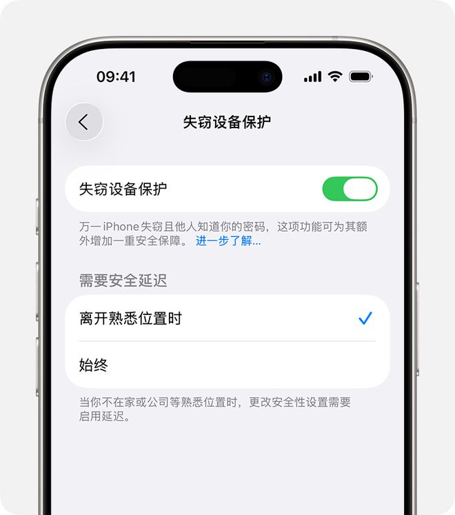 启用“失窃设备保护”后,当你的 iPhone 离开家或办公室等熟悉的地点时,某些功能和操作需要满足额外的安全要求才能使用。这些安全要求有助于防止他人在窃取你的 iPhone 并获知你的密码后,对你的账户或设备做出重大更改。