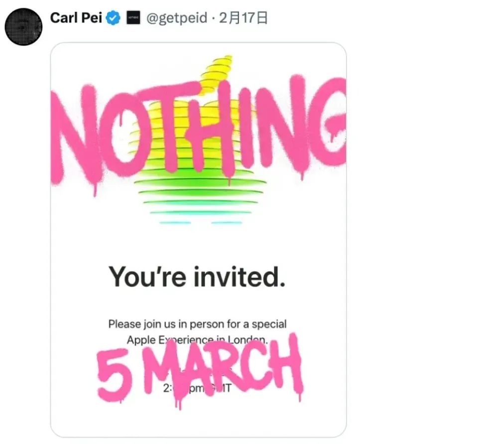 与此同时,Nothing CEO 裴宇(Carl Pei)分享了一张基于苹果邀请函魔改的海报表示, Nothing Phone(4a)系列手机将于 3 月 5 日发布。