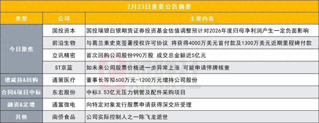 国投资本(600061.SH)公告称,近期,公司下属三级控股投资企业国投瑞银基金管理有限公司(简称“国投瑞银基金”)旗下国投瑞银白银期货证券投资基金(LOF)估值调整事项受到市场关注,国投瑞银基金已于2026年2月15日发布相关事项的专项工作方案。经初步测算,预计本次方案将对公司2026年度归母净利润产生一定负面影响,影响金额低于公司2024年度经审计归母净利润的5%,不会对公司整体业务发展产生实质性影响。