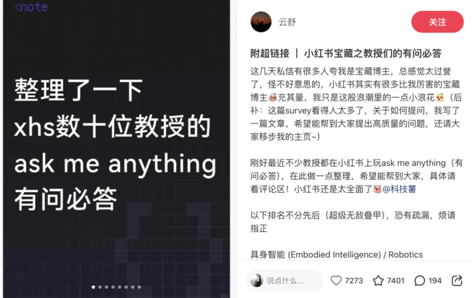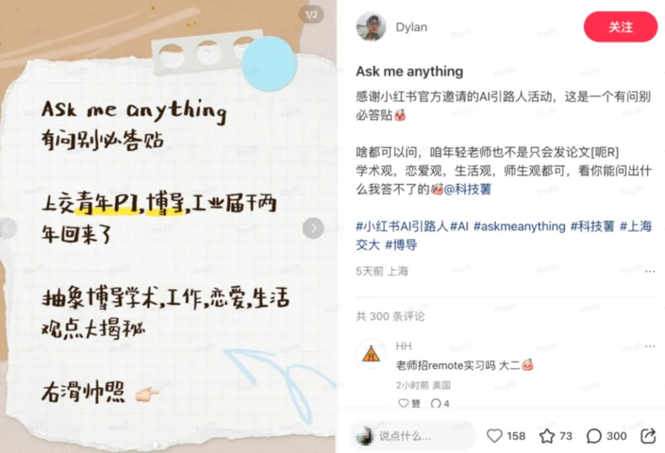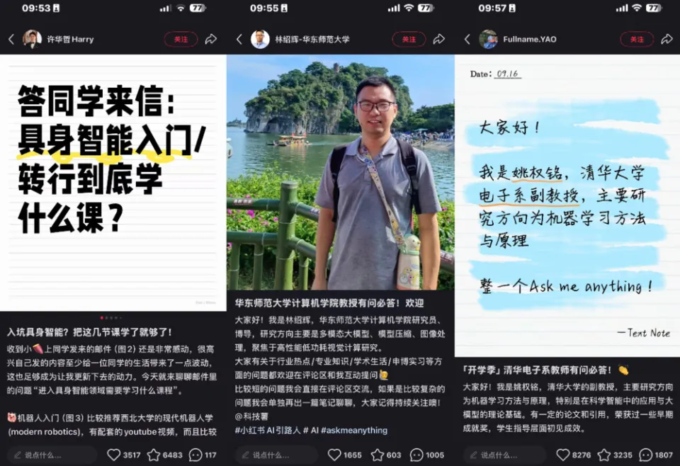第一阶段:运营基于观察,从过往站内高互动笔记精准汇总出一套 AMA 范式。尤其,在后续“AI 引路人”活动中,多位来自清北人交复、港大等 Top 高校的学者、专家一起发布 AMA 笔记,包括清华大学交叉信息研究院助理教授许华哲,华东师范大学计算机学院研究员、博导林绍辉,清华大学电子系副教授姚权铭等。