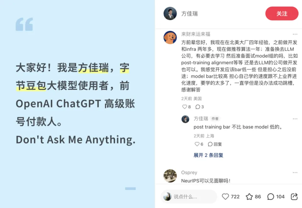 甚至,一些专业机构、互联网企业研究院负责人也闻讯而来,跳入了这场大讨论,如上海人工智能实验室领军青年科学家 大模型中心负责人陈恺、腾讯混元 Principal 科学家,前 DeepMind RL 成员徐仲文、月之暗面强化学习负责人 Flood Sung、通义千问研究员郑楚杰均在小红书与网友 Socialize。