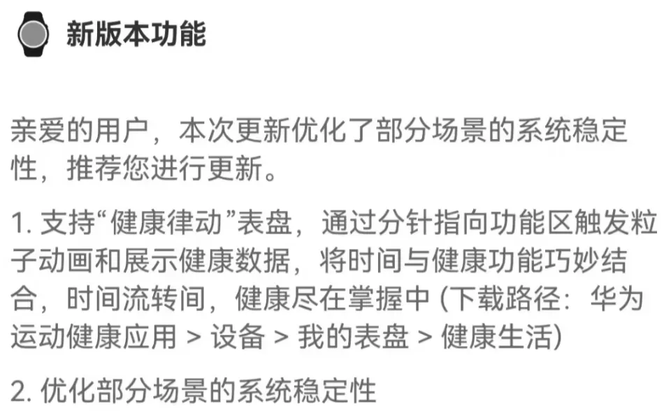 1.支持“健康律动”表盘,通过分针指向功能区触发粒子动画和展示健康数据,将时间与健康功能巧妙结合,时间流转间,健康尽在掌握中(下载路径:华为运动健康应用>设备>我的表盘>健康生活)