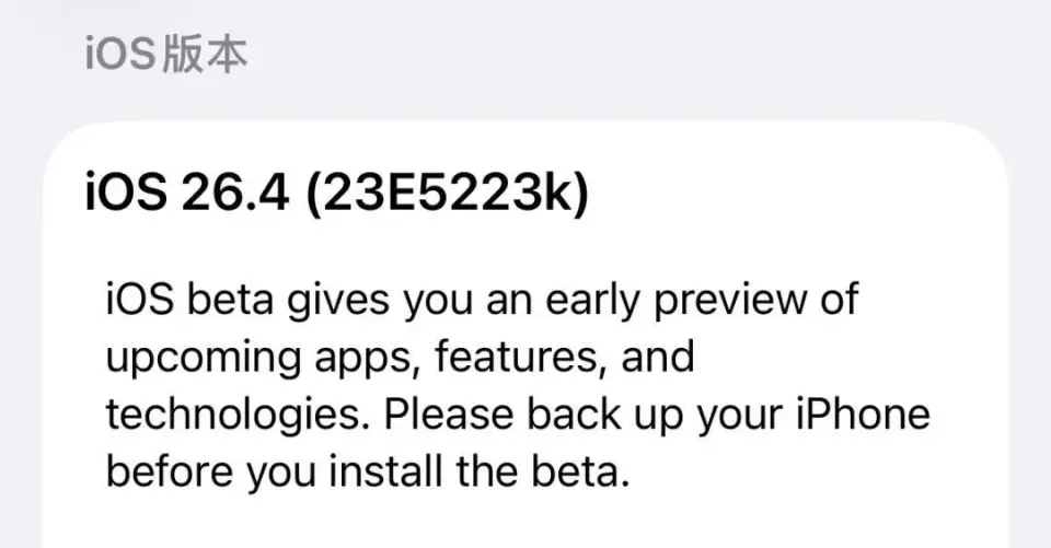 iOS 26.4 Beta 3 v.2 更新后版本号由 23E5223f 改成了 23E5223k,更新日志没有显示更新内容。