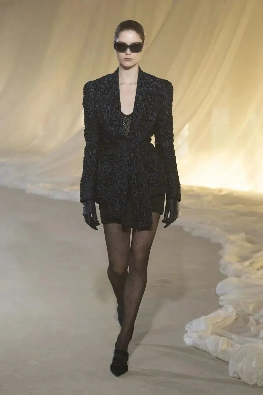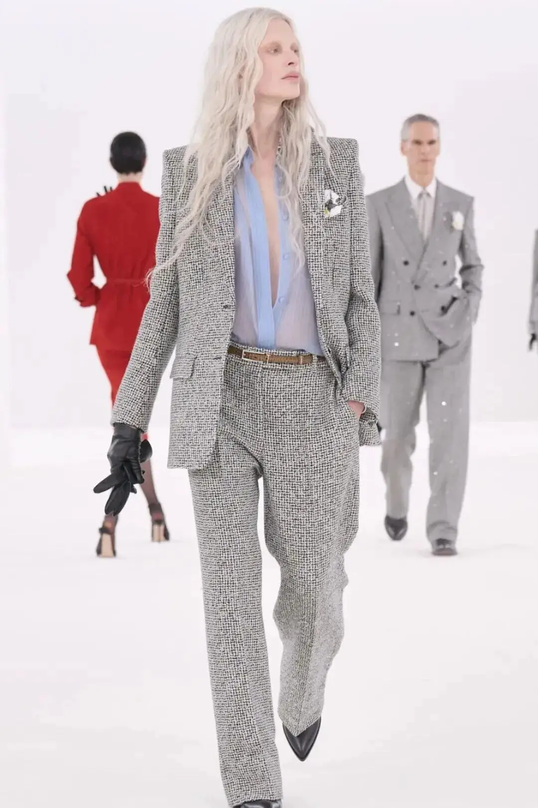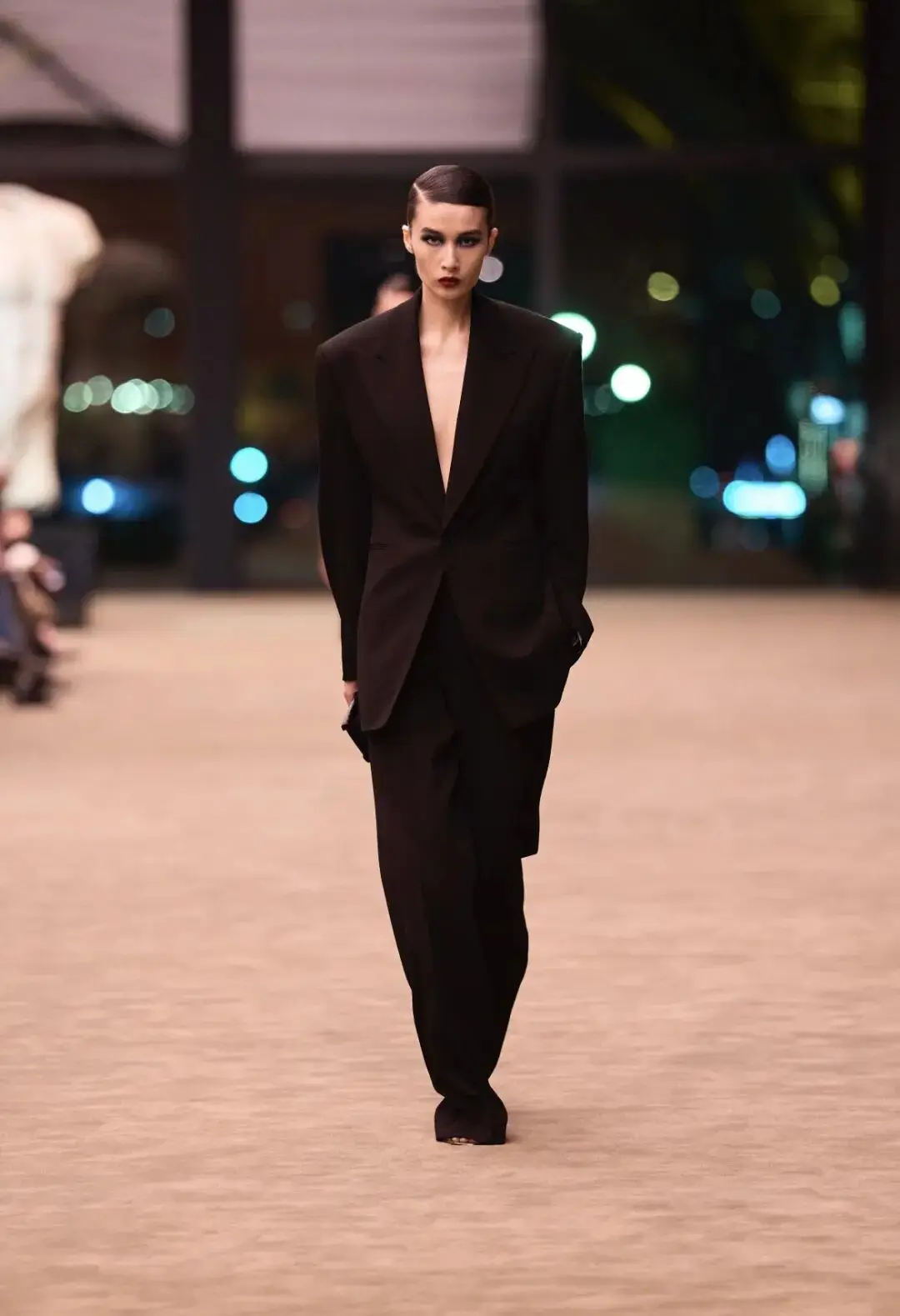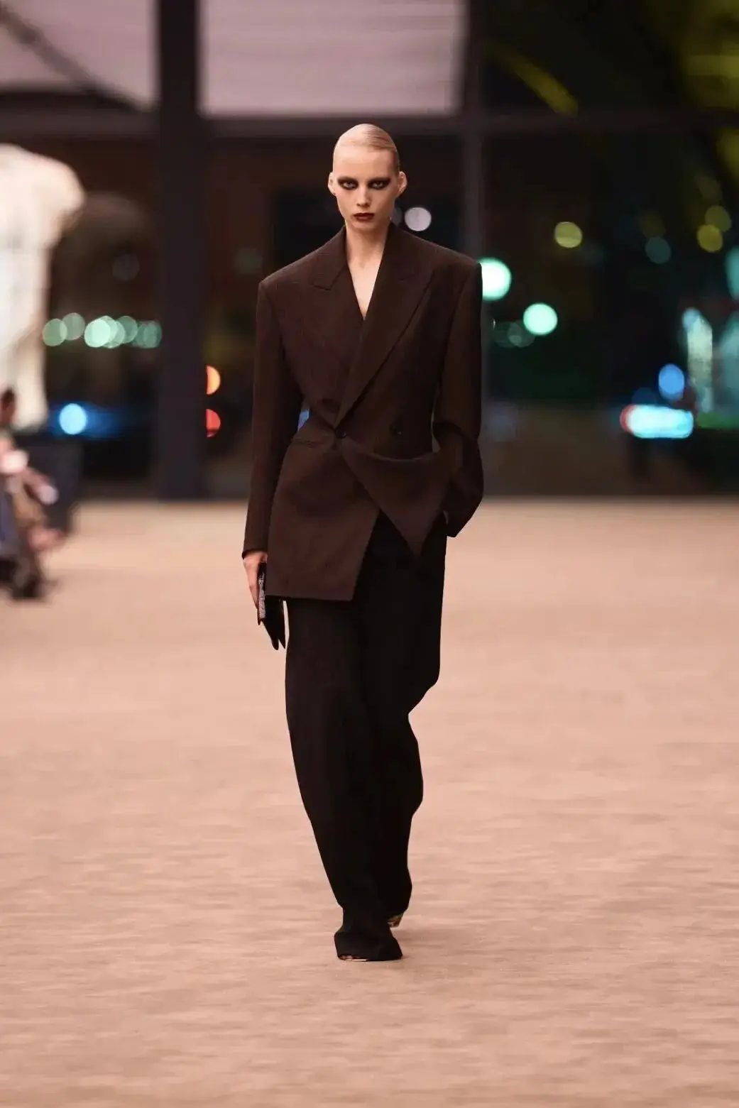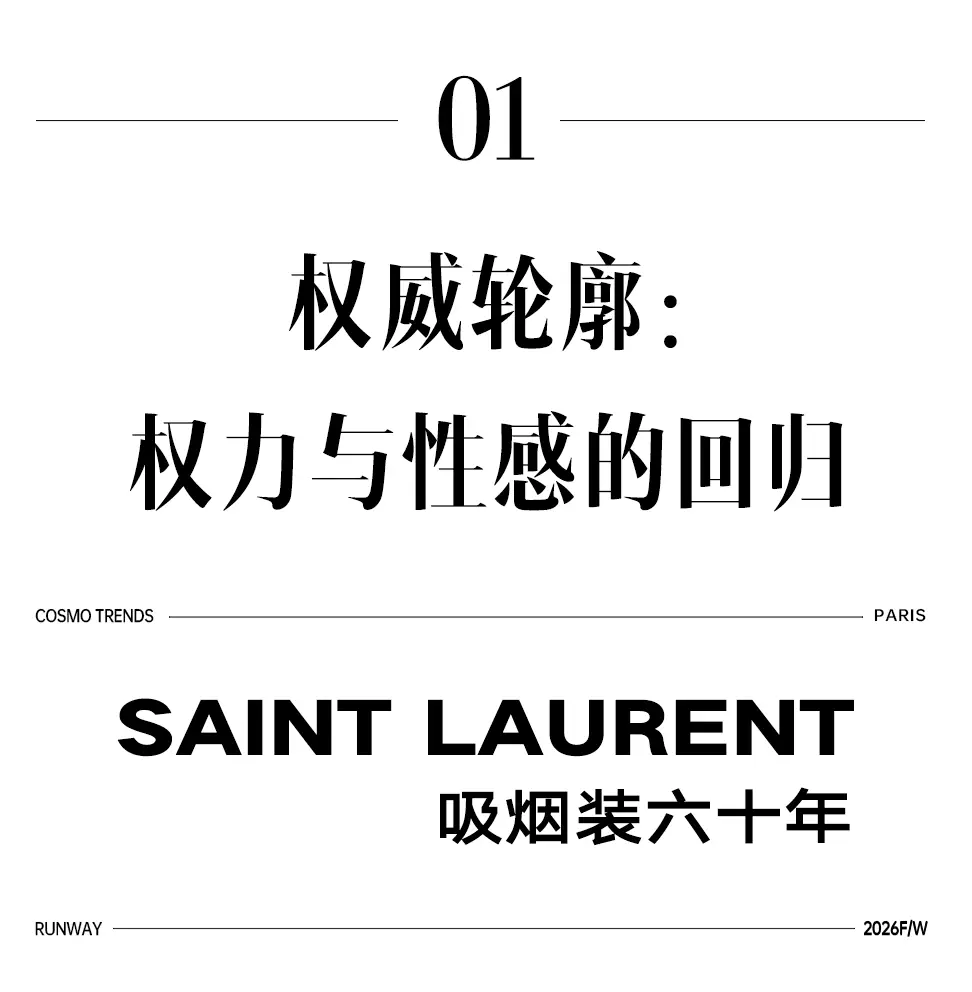 这也是Vaccarello最擅长的叙事方式:Vaccarello本季的灵感来自法国演员Romy Schneider在1971年电影《Max et les Ferrailleurs》中的形象,模特以极其明确的Saint Laurent女性形象登场:侧分发线、湿发质感的低发髻、深色唇妆和烟熏眼影。因此整场秀呈现出一种介于优雅与脆弱之间的情绪张力。