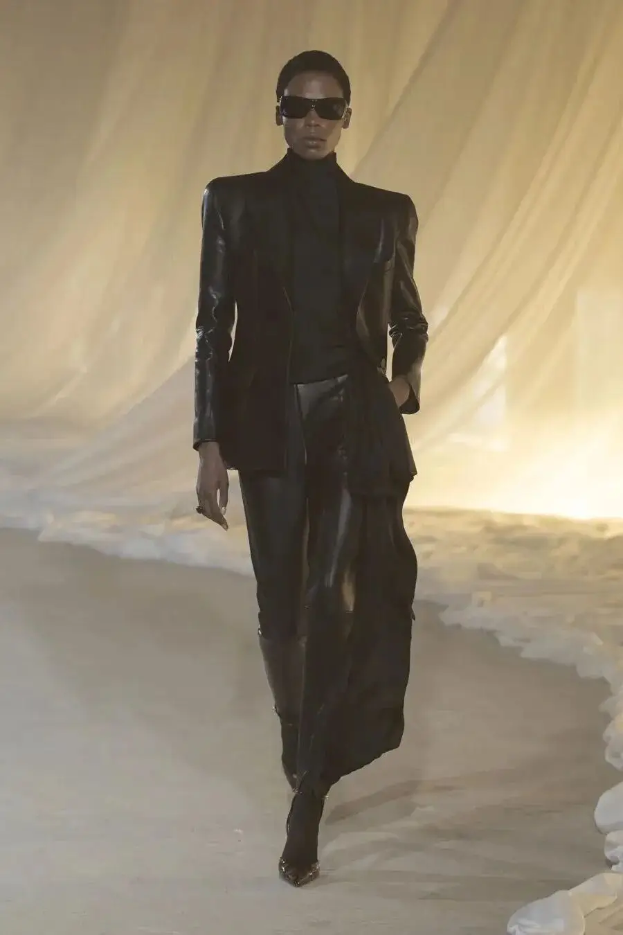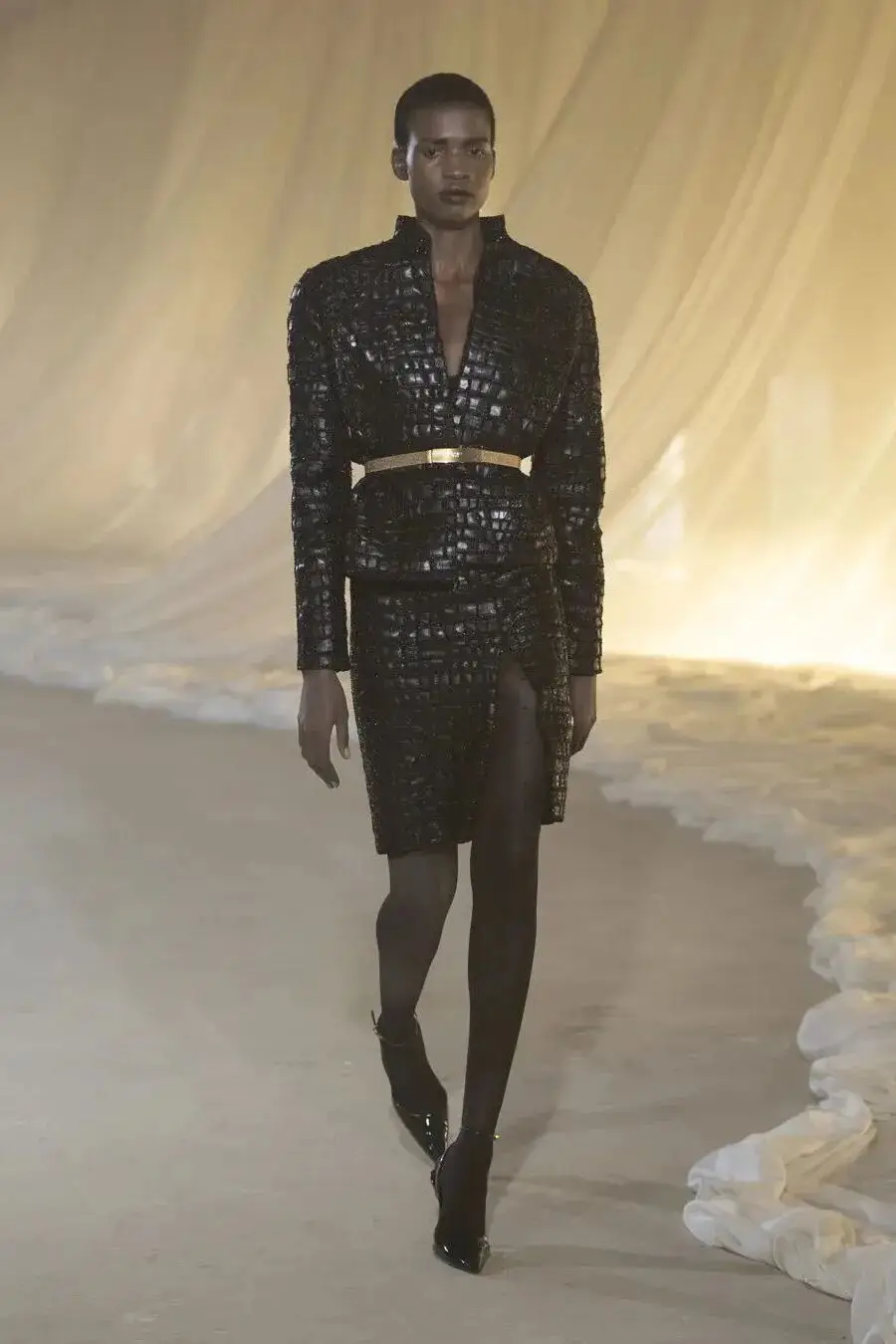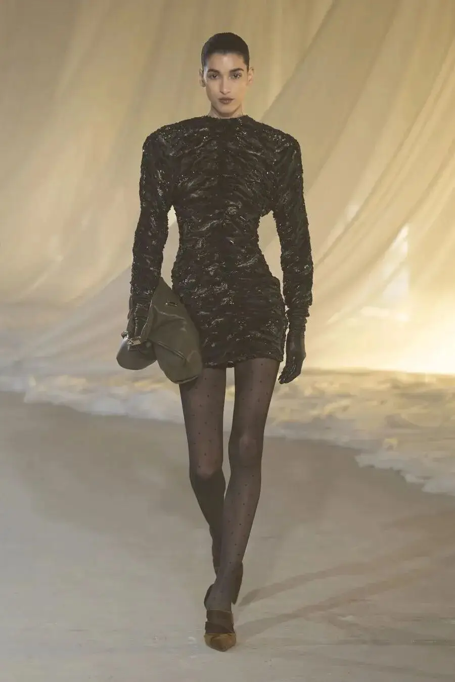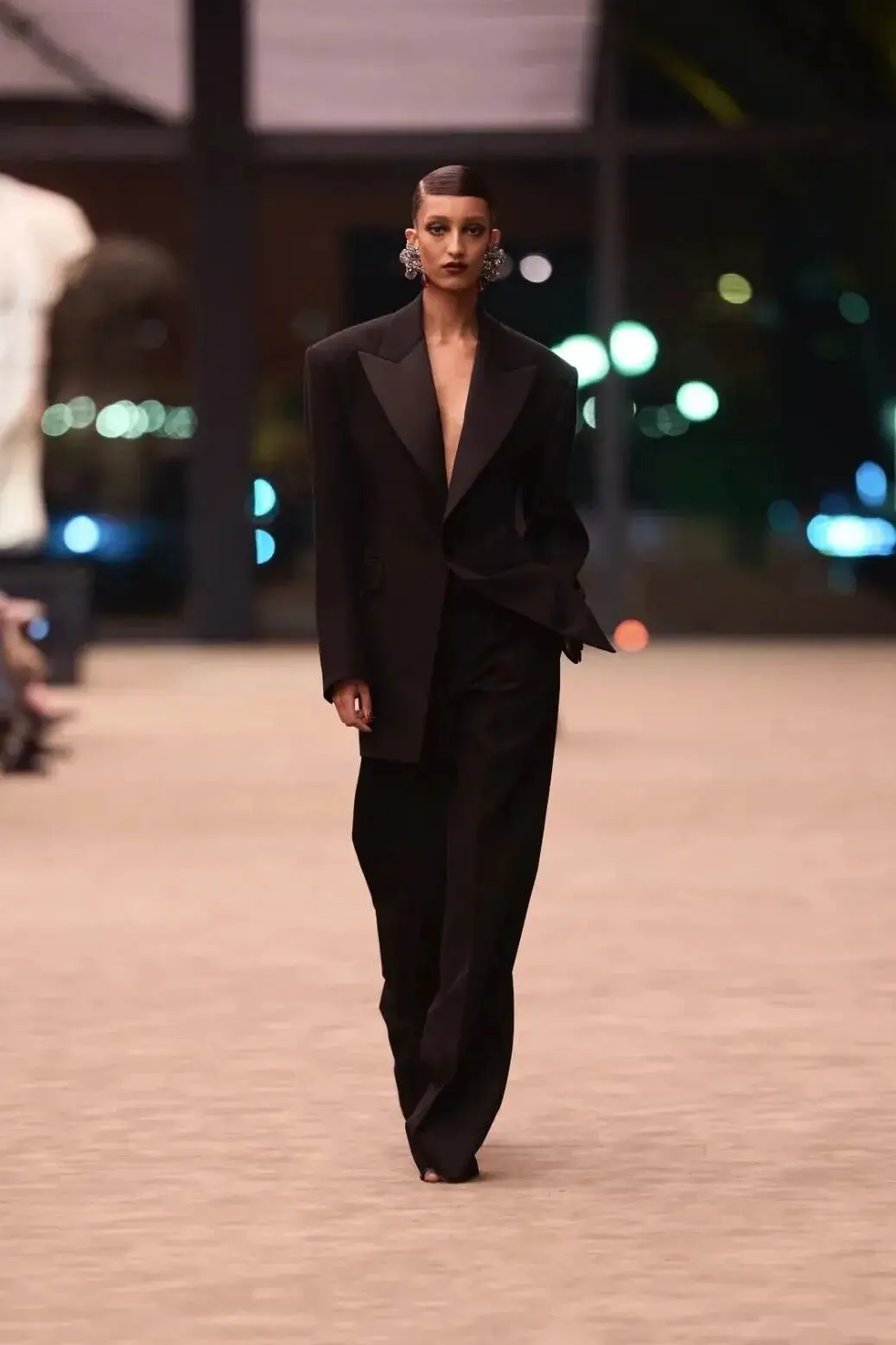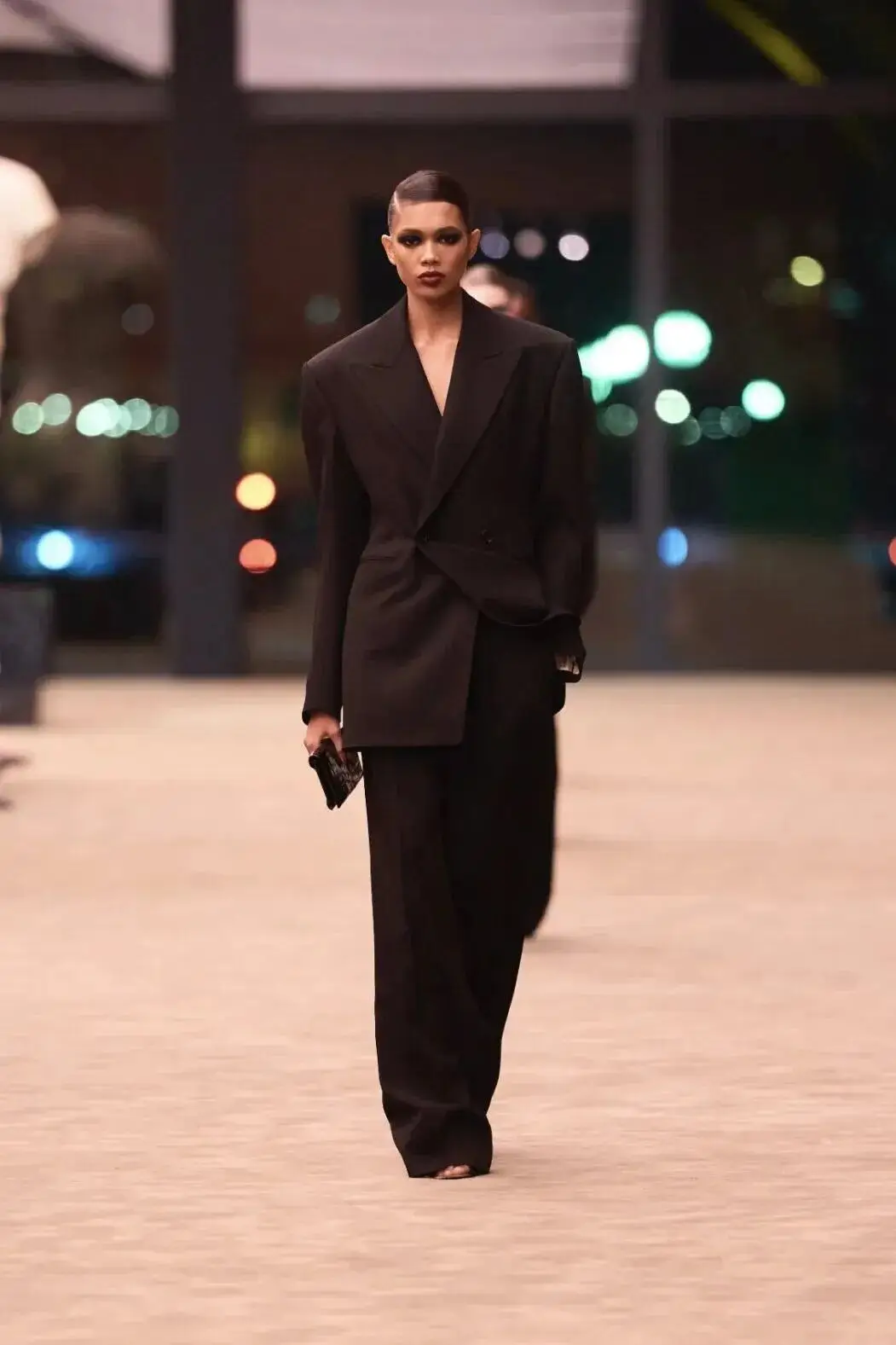 这也是Vaccarello最擅长的叙事方式:Vaccarello本季的灵感来自法国演员Romy Schneider在1971年电影《Max et les Ferrailleurs》中的形象,模特以极其明确的Saint Laurent女性形象登场:侧分发线、湿发质感的低发髻、深色唇妆和烟熏眼影。因此整场秀呈现出一种介于优雅与脆弱之间的情绪张力。