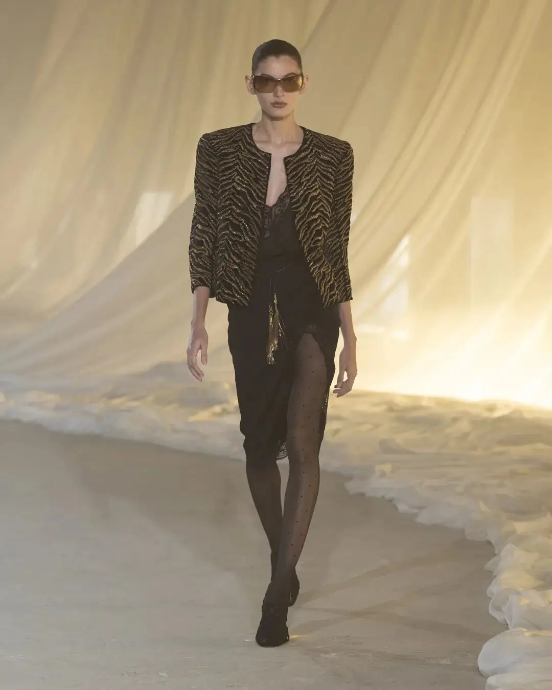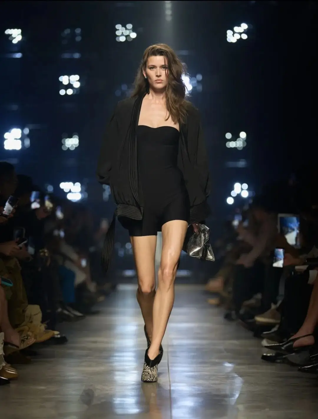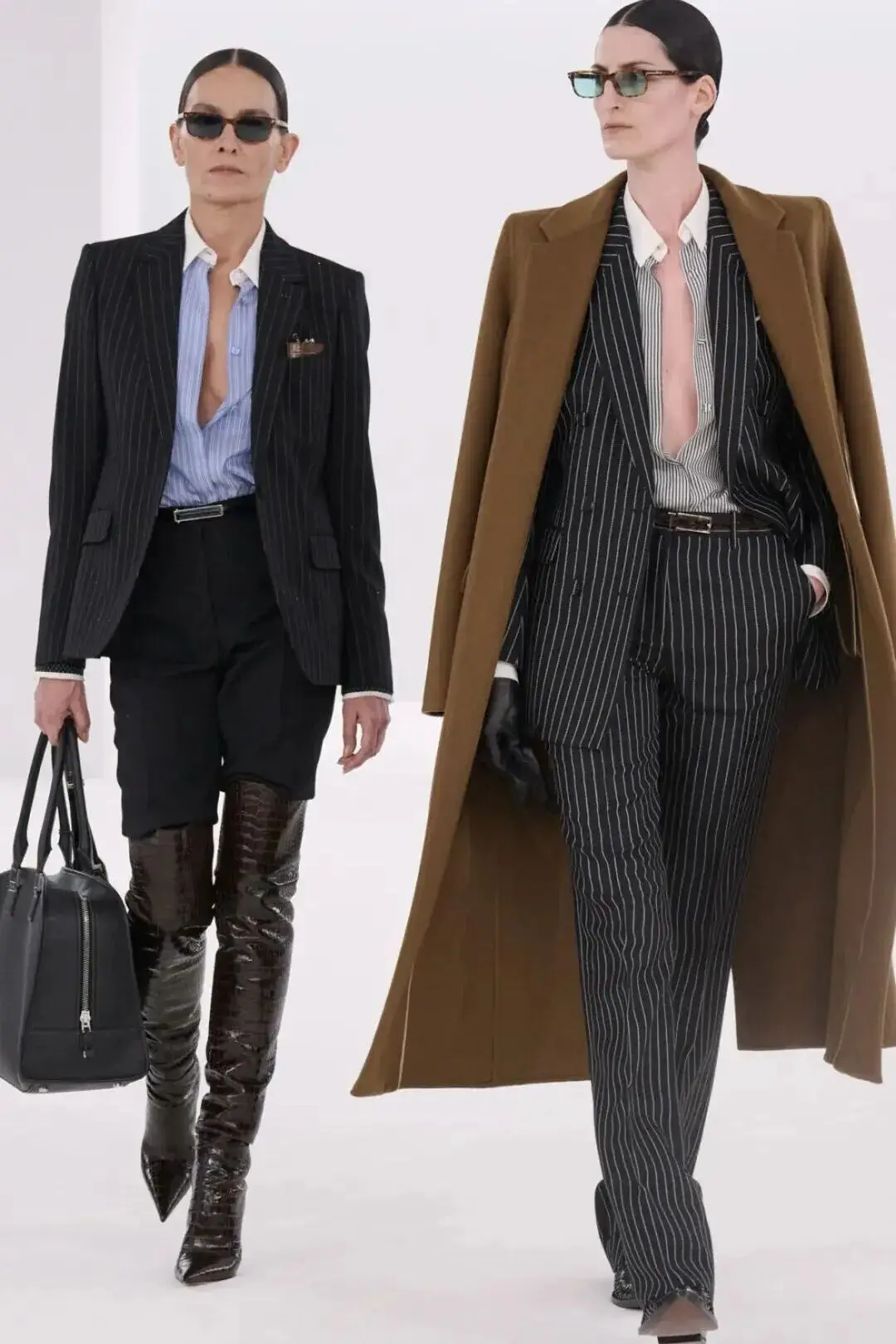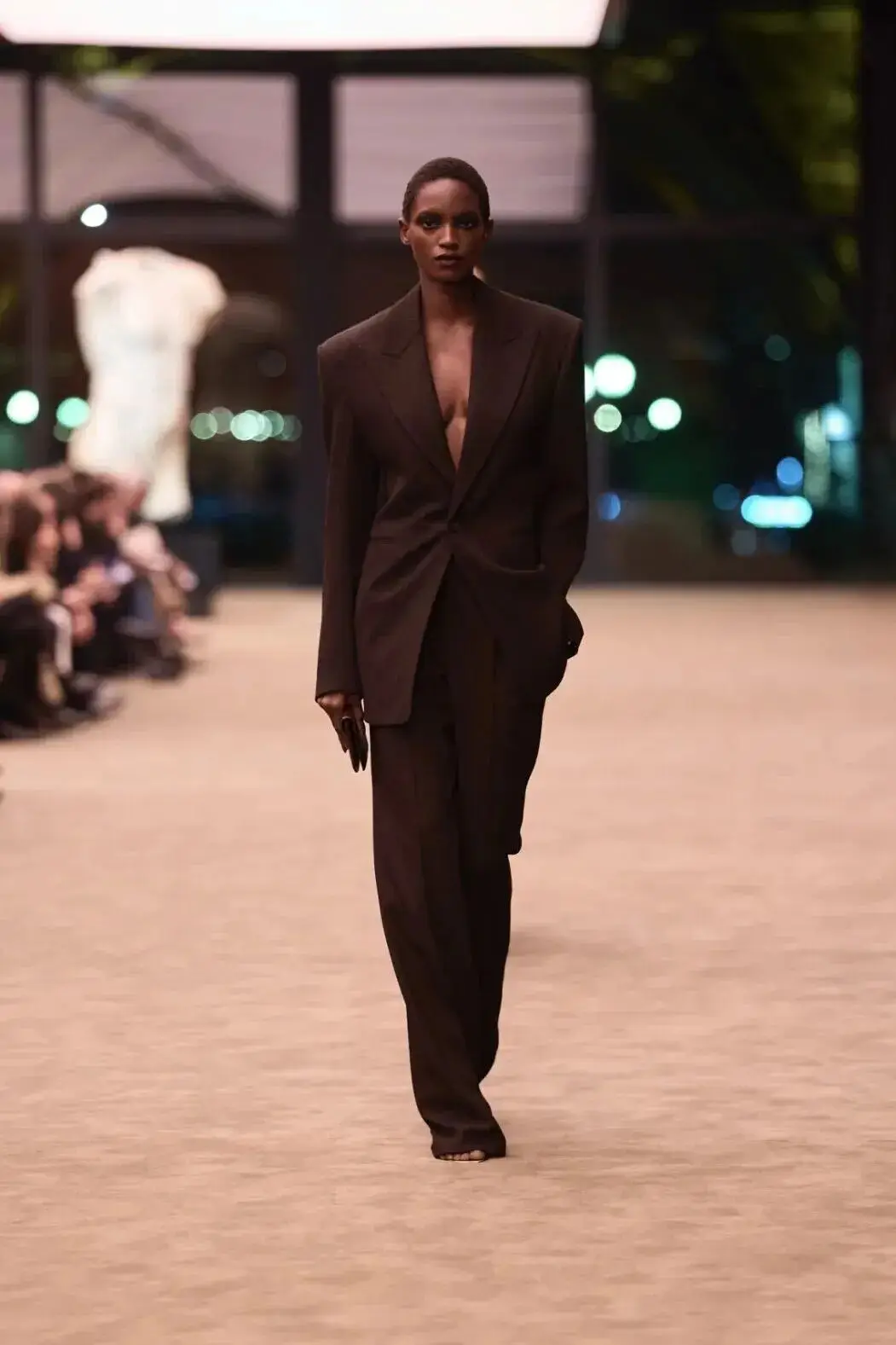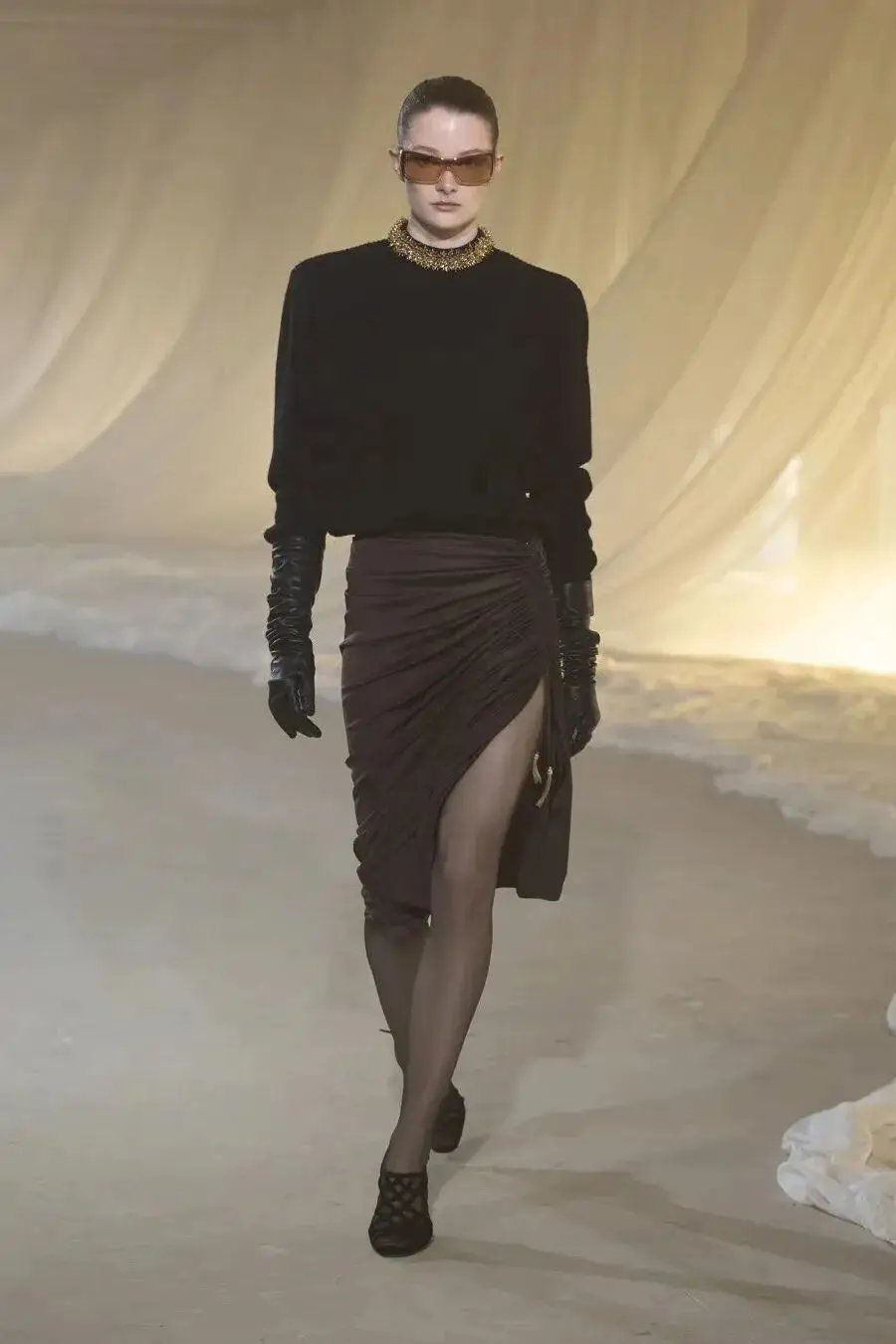 这也是Vaccarello最擅长的叙事方式:Vaccarello本季的灵感来自法国演员Romy Schneider在1971年电影《Max et les Ferrailleurs》中的形象,模特以极其明确的Saint Laurent女性形象登场:侧分发线、湿发质感的低发髻、深色唇妆和烟熏眼影。因此整场秀呈现出一种介于优雅与脆弱之间的情绪张力。