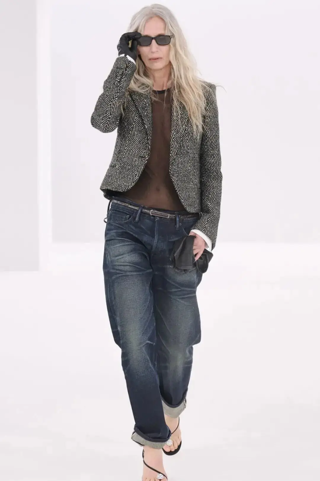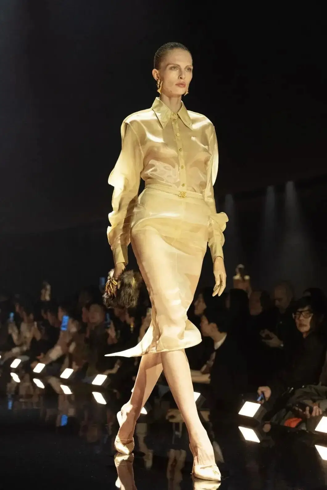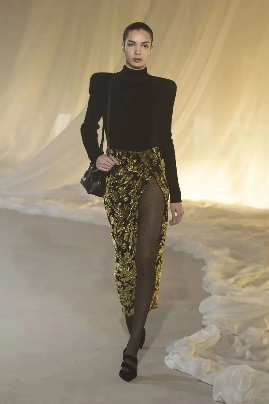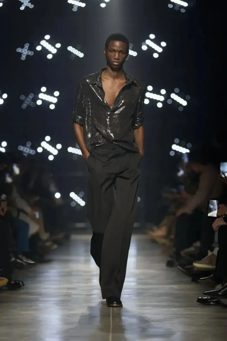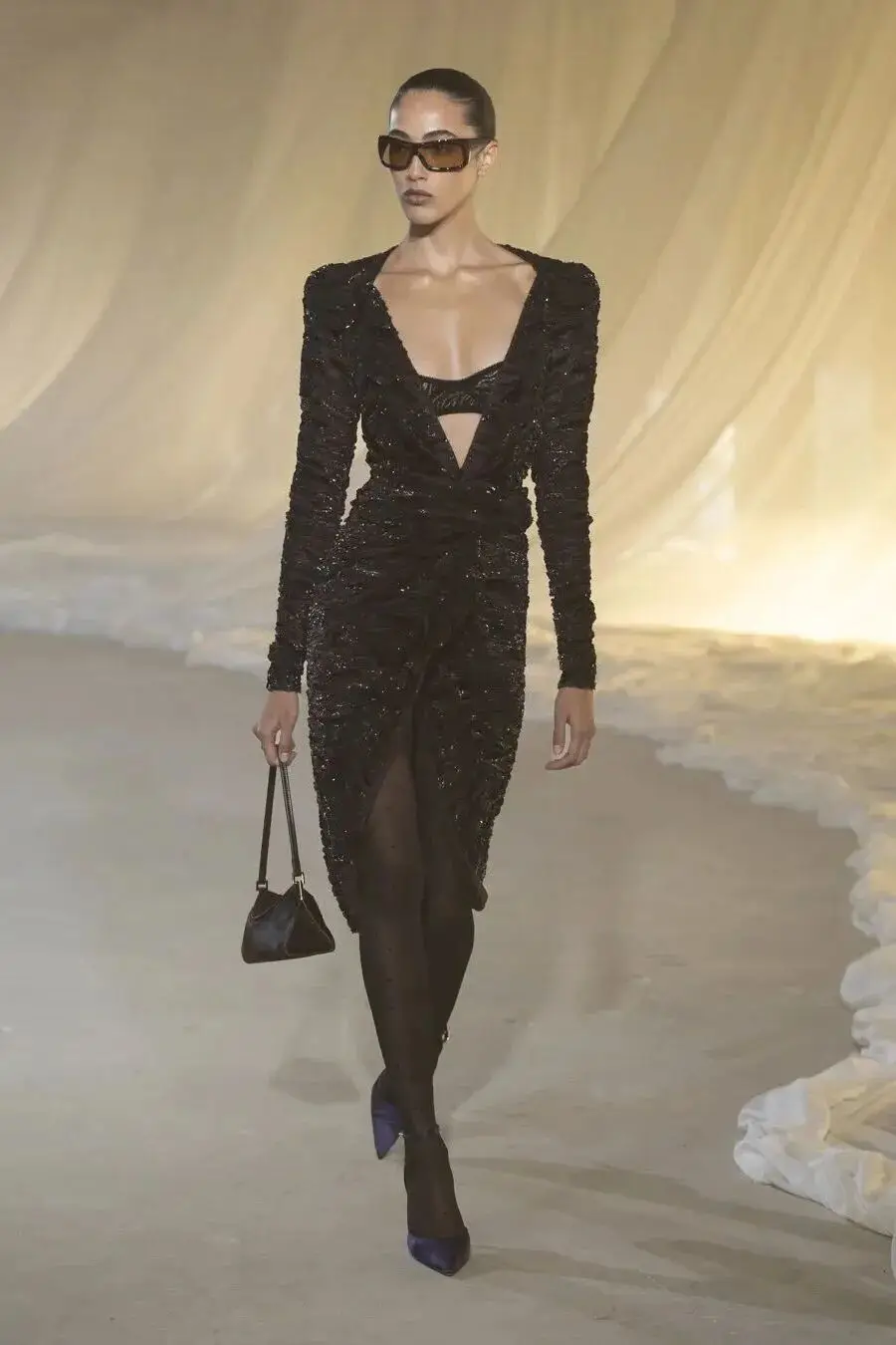 这也是Vaccarello最擅长的叙事方式:Vaccarello本季的灵感来自法国演员Romy Schneider在1971年电影《Max et les Ferrailleurs》中的形象,模特以极其明确的Saint Laurent女性形象登场:侧分发线、湿发质感的低发髻、深色唇妆和烟熏眼影。因此整场秀呈现出一种介于优雅与脆弱之间的情绪张力。