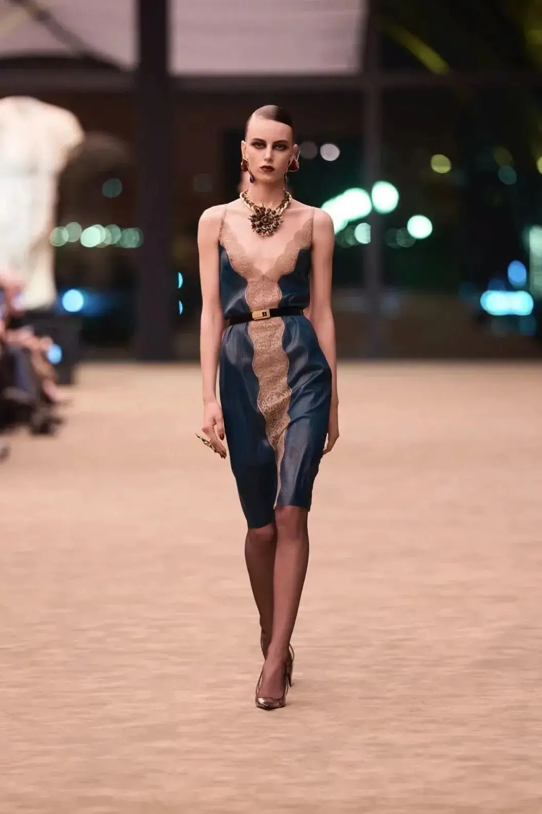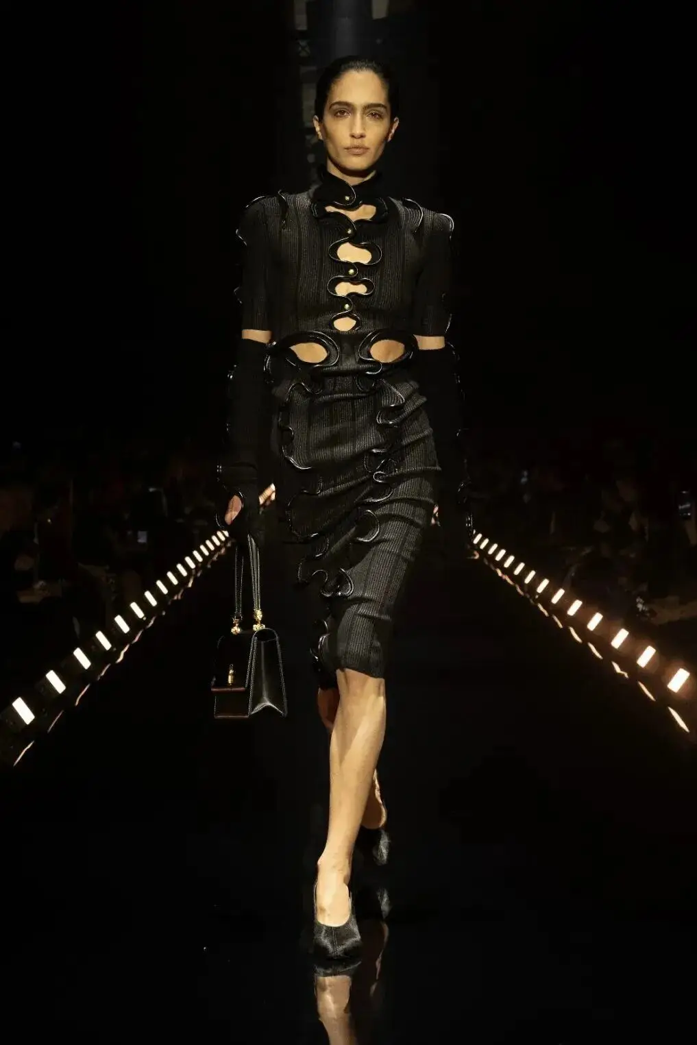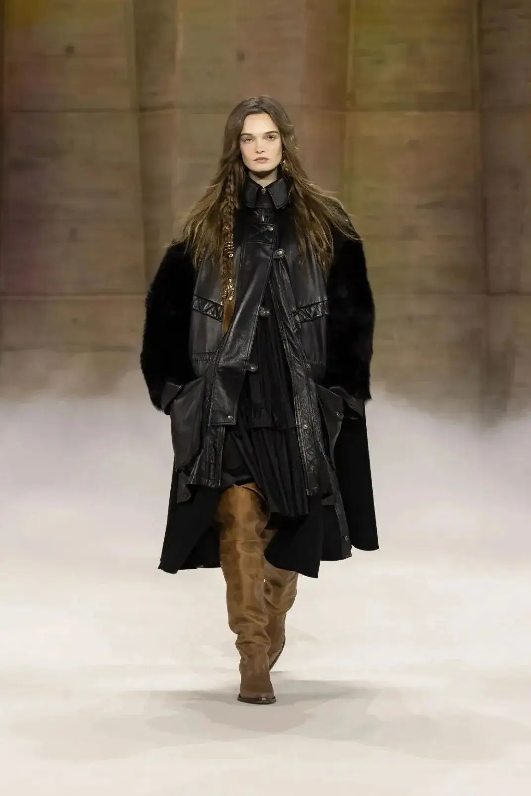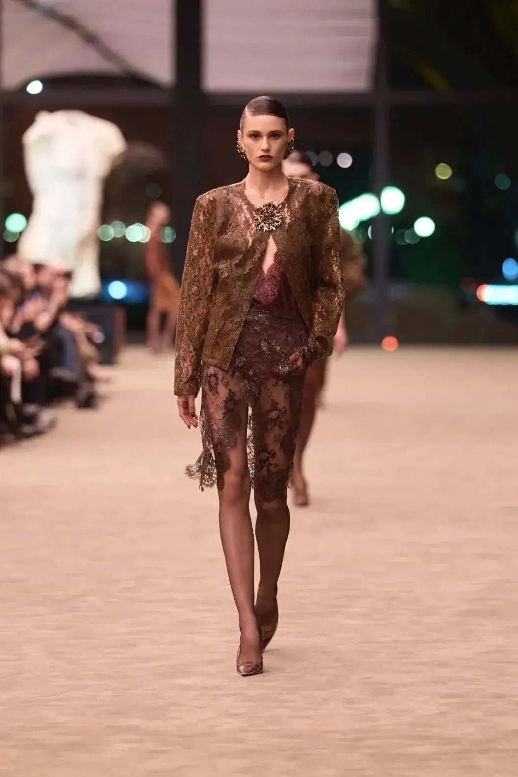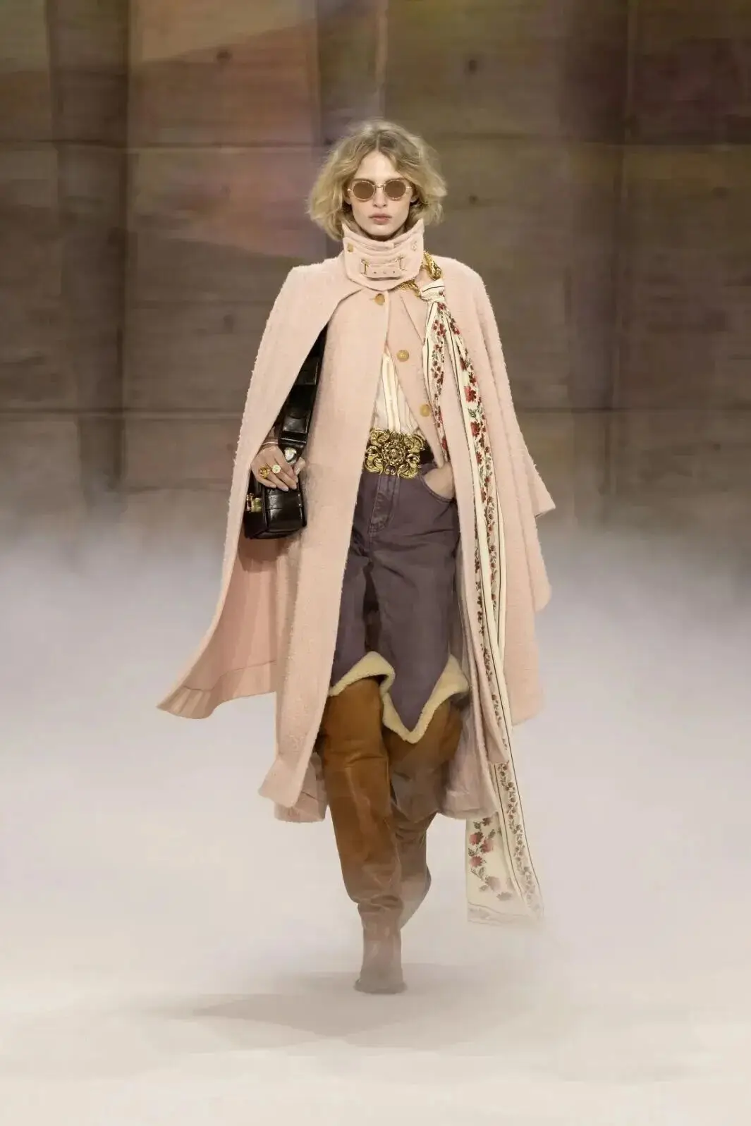 这也是Vaccarello最擅长的叙事方式:Vaccarello本季的灵感来自法国演员Romy Schneider在1971年电影《Max et les Ferrailleurs》中的形象,模特以极其明确的Saint Laurent女性形象登场:侧分发线、湿发质感的低发髻、深色唇妆和烟熏眼影。因此整场秀呈现出一种介于优雅与脆弱之间的情绪张力。