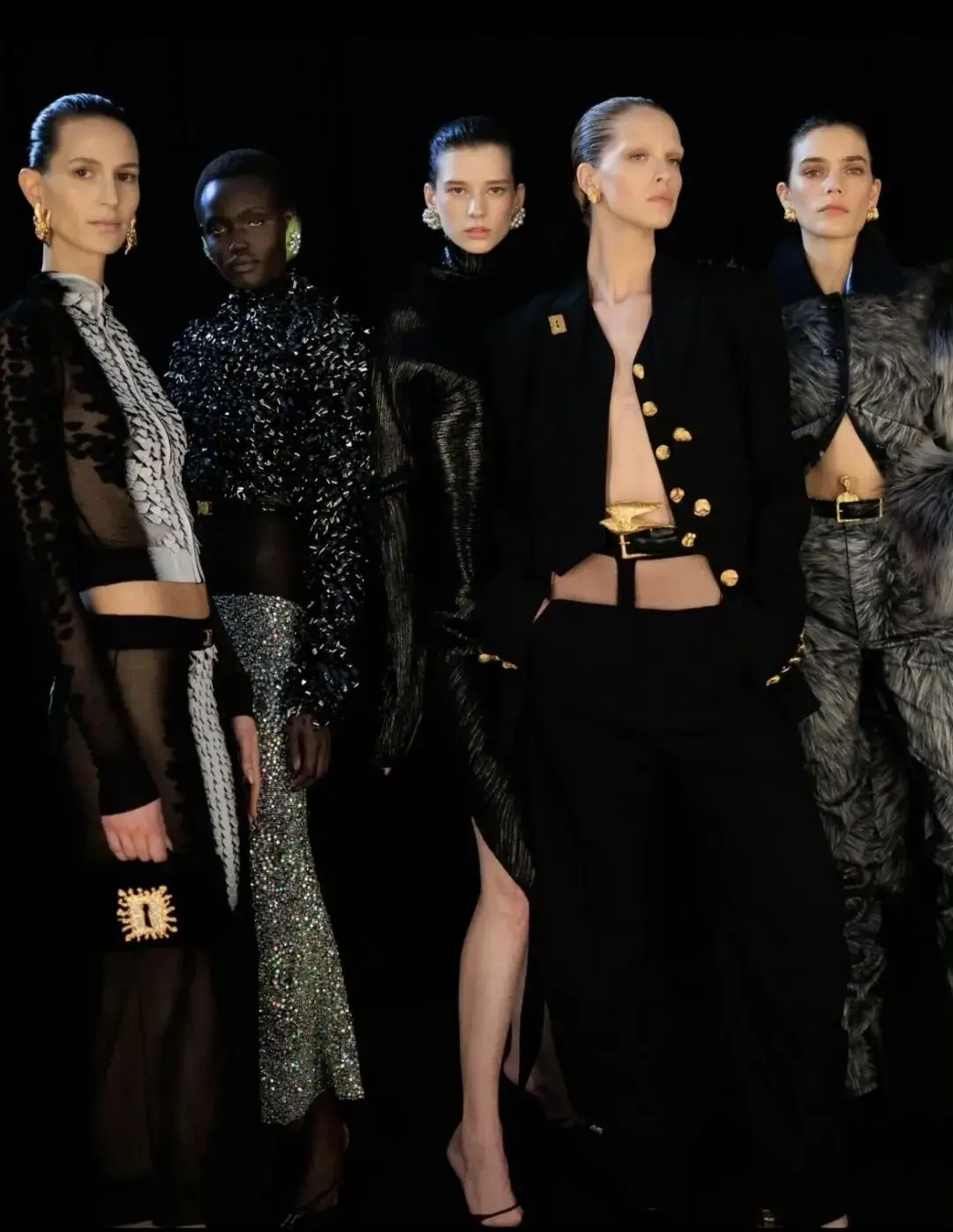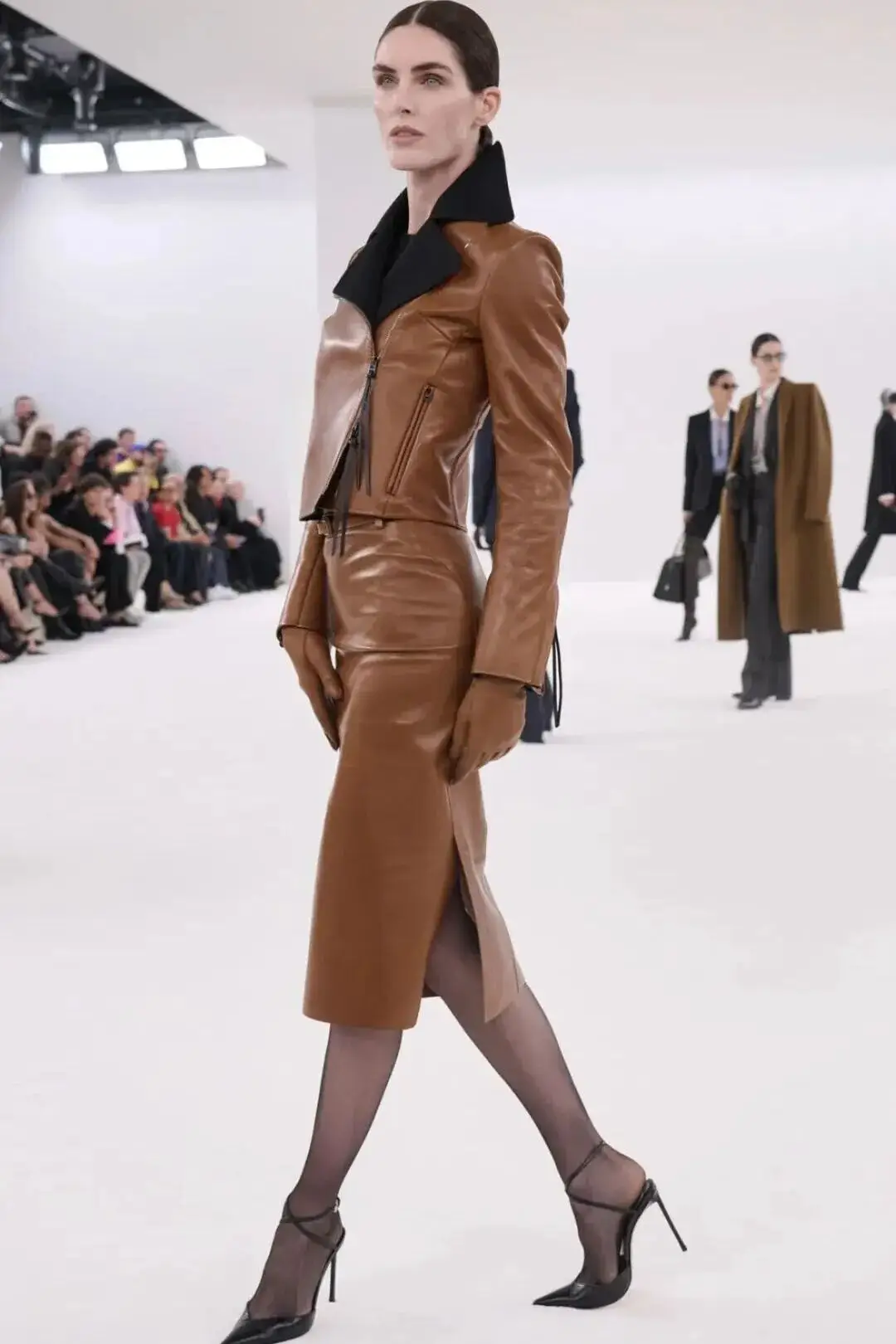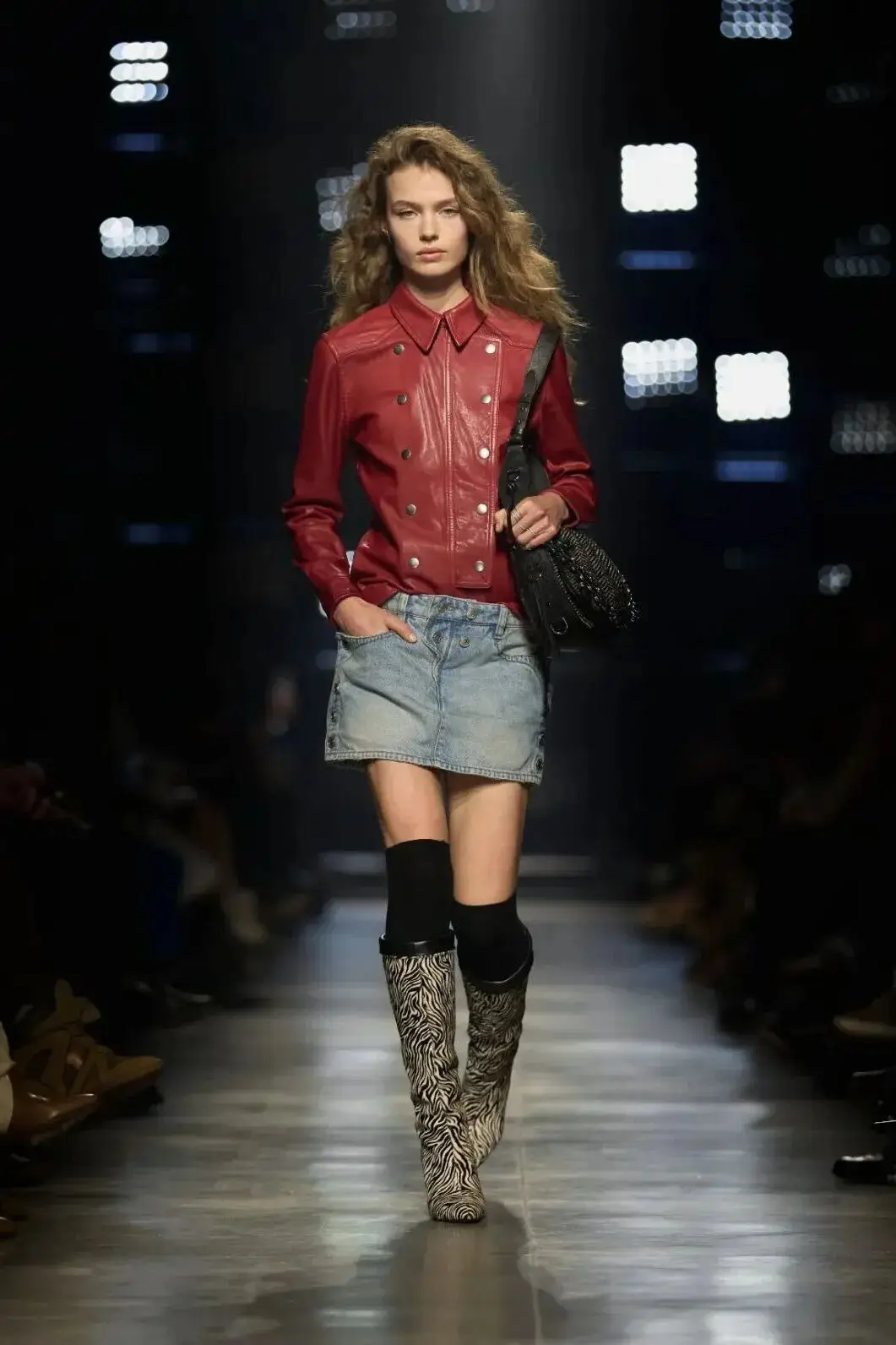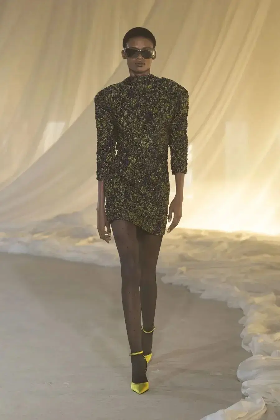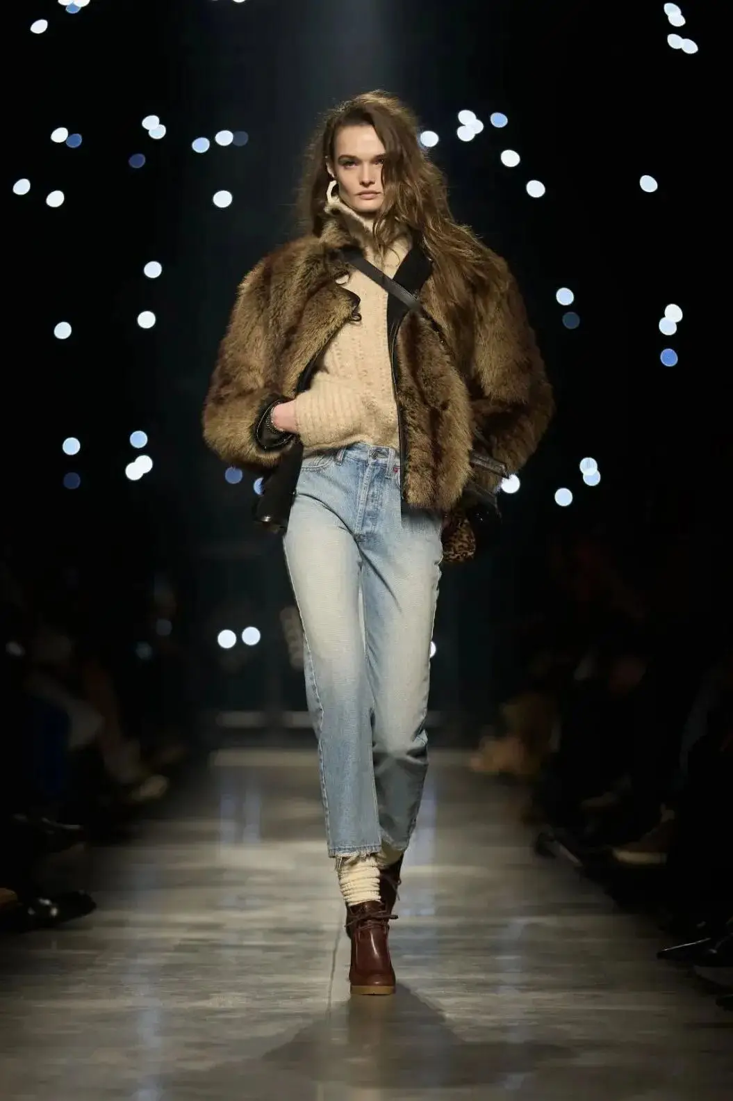 这也是Vaccarello最擅长的叙事方式:Vaccarello本季的灵感来自法国演员Romy Schneider在1971年电影《Max et les Ferrailleurs》中的形象,模特以极其明确的Saint Laurent女性形象登场:侧分发线、湿发质感的低发髻、深色唇妆和烟熏眼影。因此整场秀呈现出一种介于优雅与脆弱之间的情绪张力。