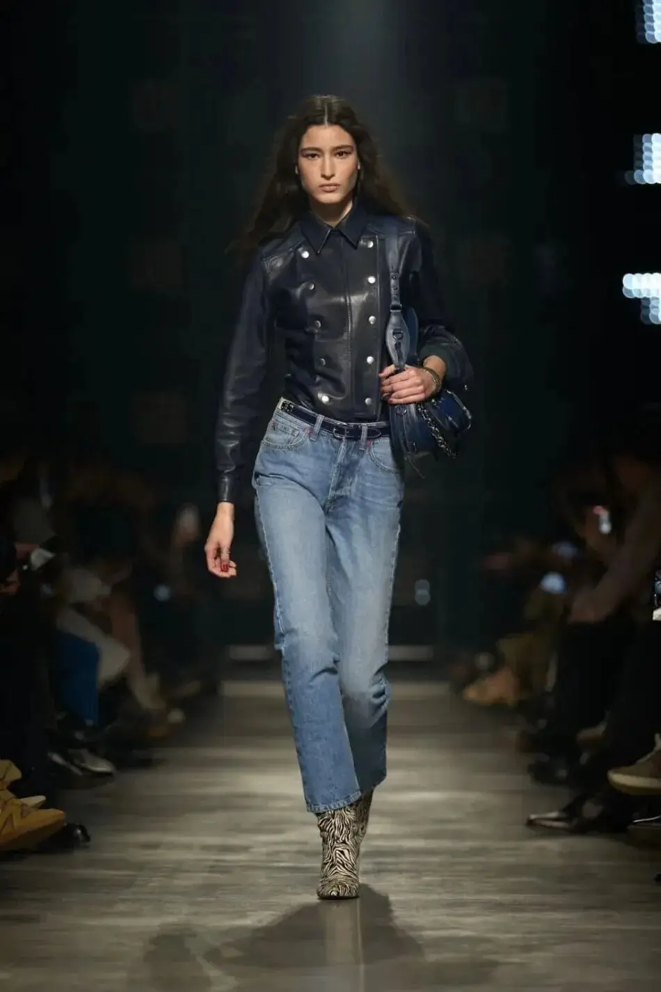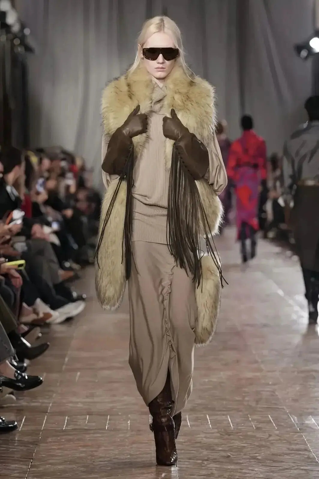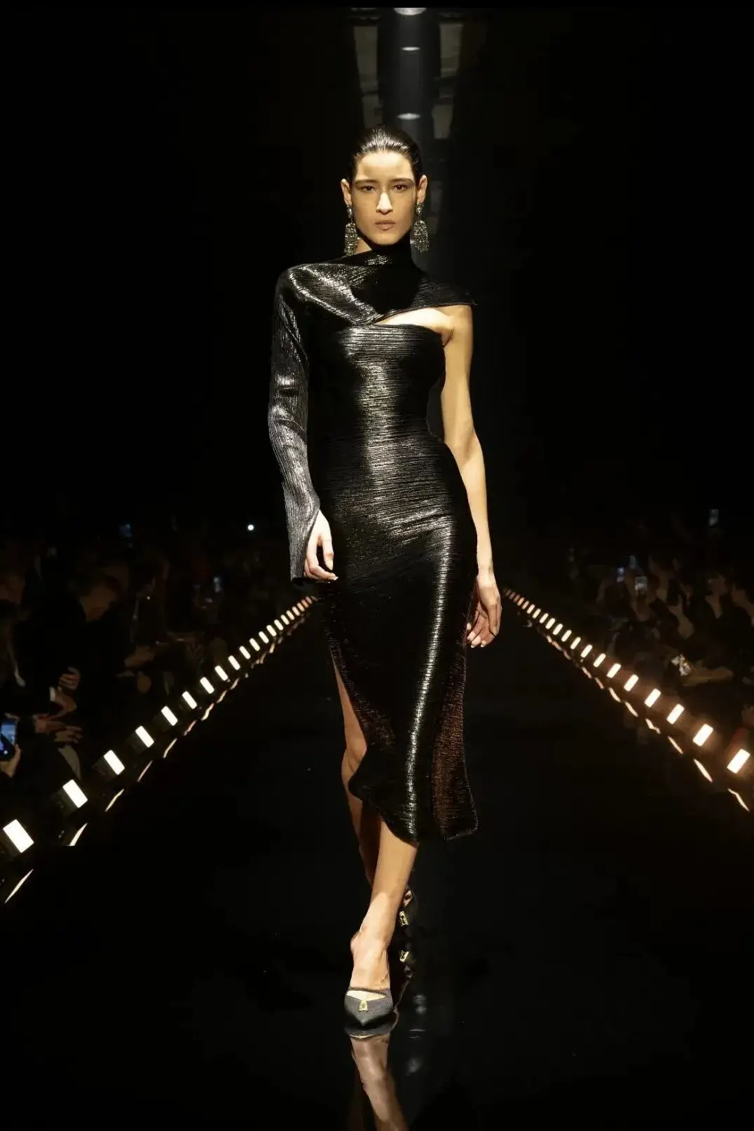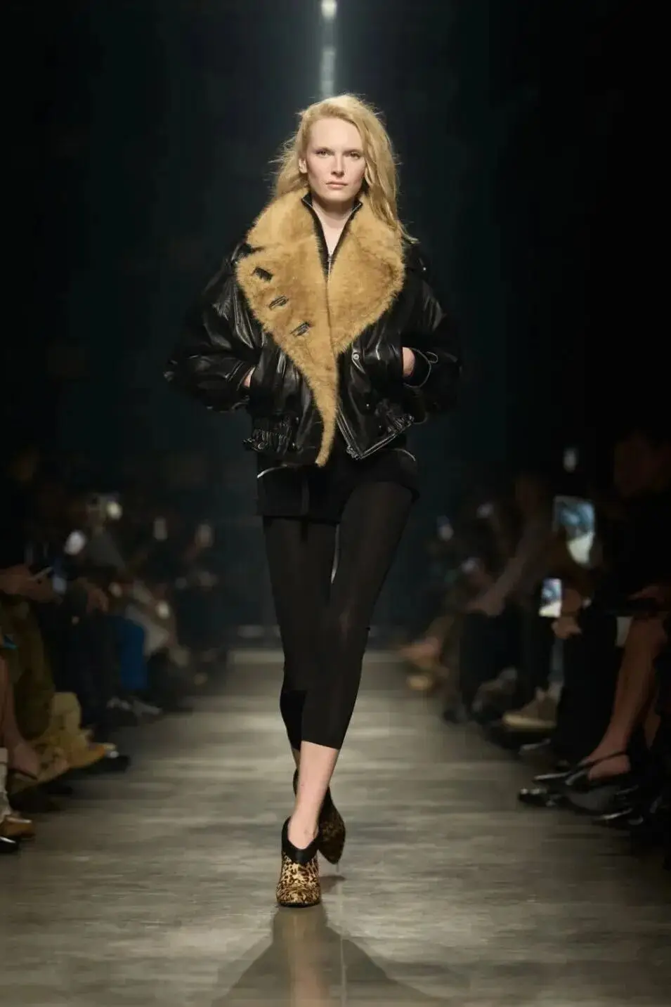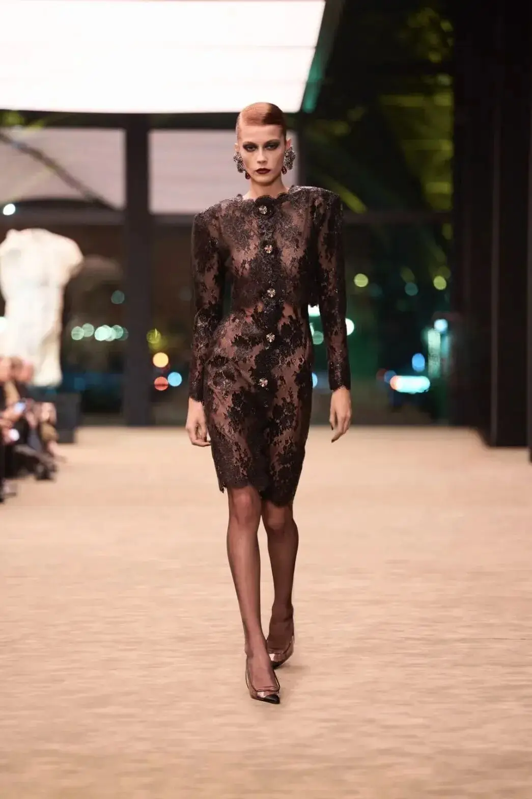这也是Vaccarello最擅长的叙事方式:Vaccarello本季的灵感来自法国演员Romy Schneider在1971年电影《Max et les Ferrailleurs》中的形象,模特以极其明确的Saint Laurent女性形象登场:侧分发线、湿发质感的低发髻、深色唇妆和烟熏眼影。因此整场秀呈现出一种介于优雅与脆弱之间的情绪张力。
